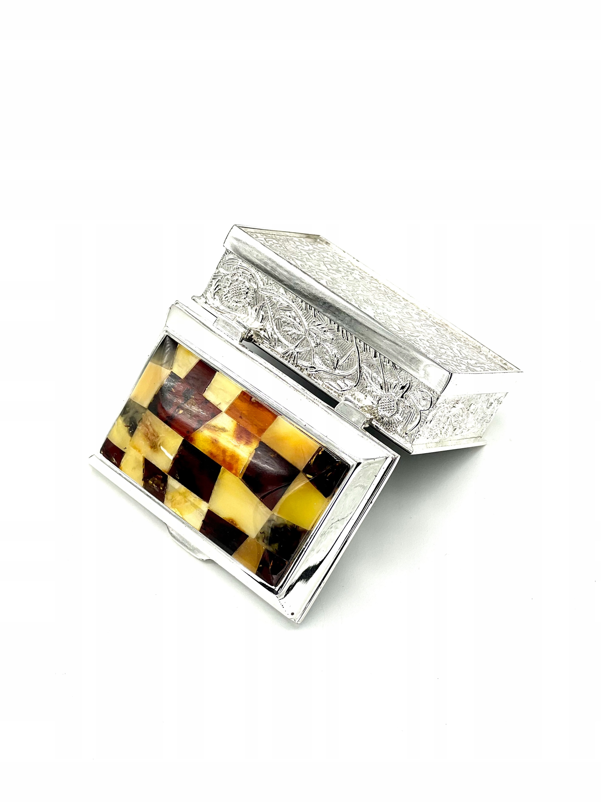 Красива металева скринька, вкрита бурштиновою мозаїкою з маленьких полірованих шматочків бурштину. Стилізована під скриньку для коштовностей із втраченої Бурштинової кімнати.