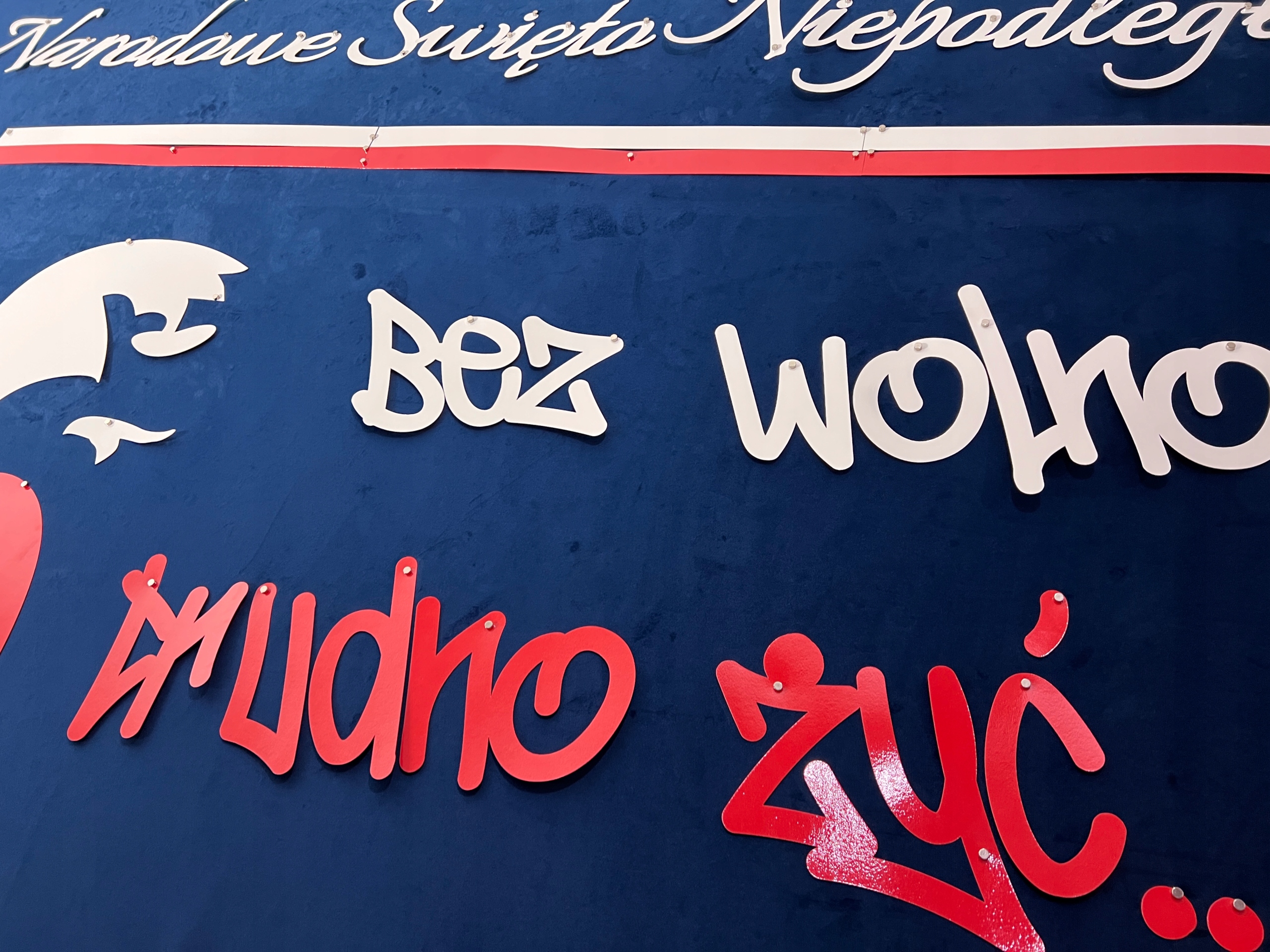 - напис Важко жити без свободи... - білий і червоний - висота літери бл. 15-18 см