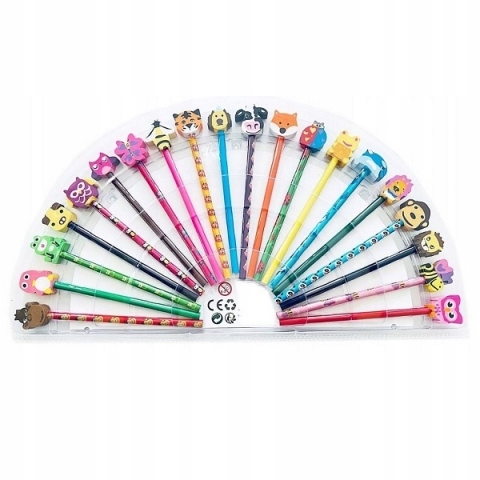 набір барвистих олівців та олівців для малювання з декоративною еластикою . Кожен олівець і олівець має закінчення у вигляді гумки, кожен з різним малюнком тварин. Кожна гумка підходить до заданого олівця, олівців, на яких він знаходиться.
