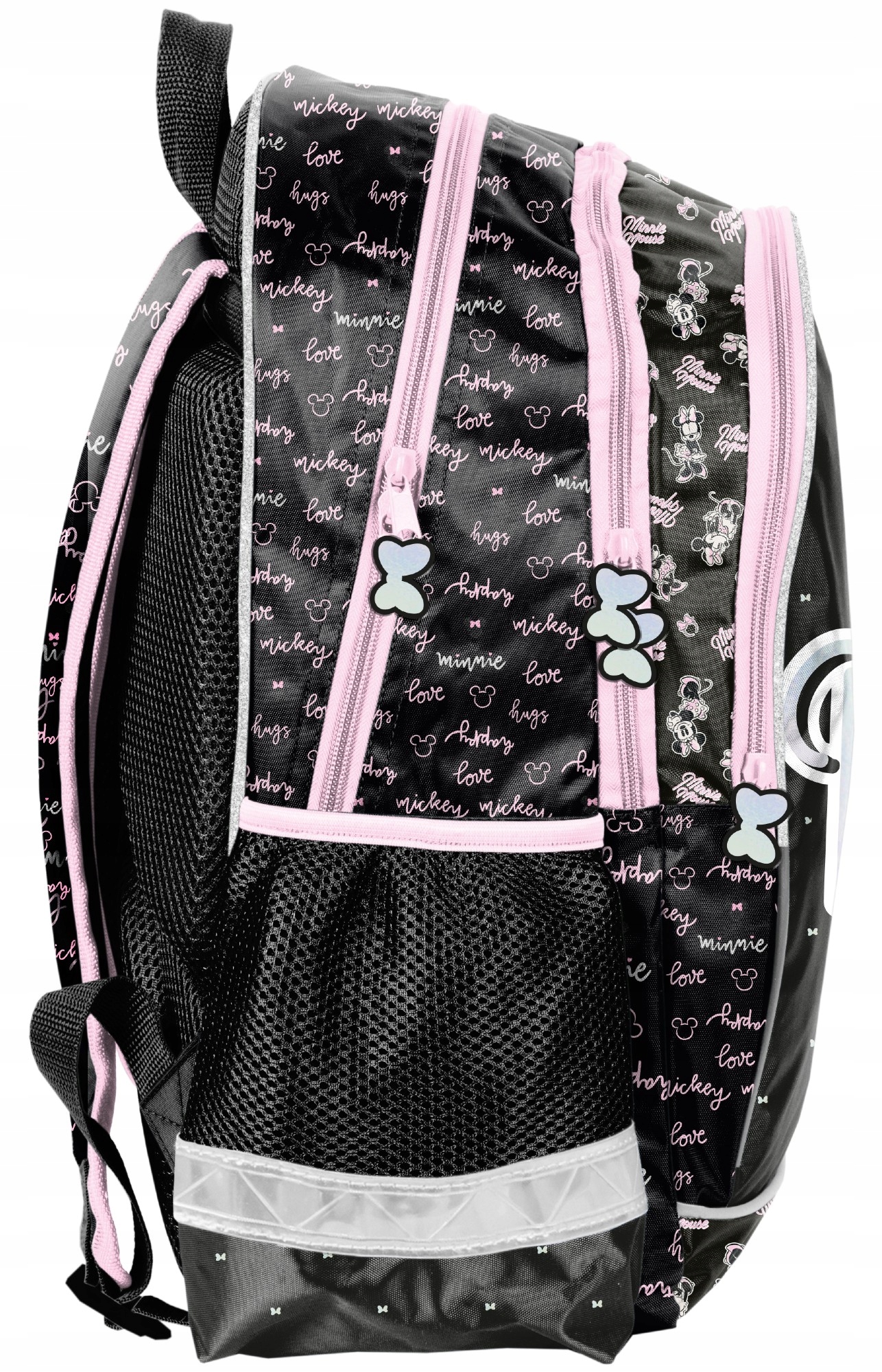 Рюкзак чорно-рожевий, з елементами декору Minnie Mouse. Він був виготовлений з матеріалів найвищої якості. Він легкий, має жорстку профільовану спинку, зручні ергономічні лямки, має м’який поролон, який адаптується до спини дитини, зберігаючи хребет у прямому положенні. Він оснащений численними світловідбиваючими елементами, які забезпечать безпеку. Має два основних відділення, меншу передню кишеню та дві сітчасті кишені для аксесуарів.