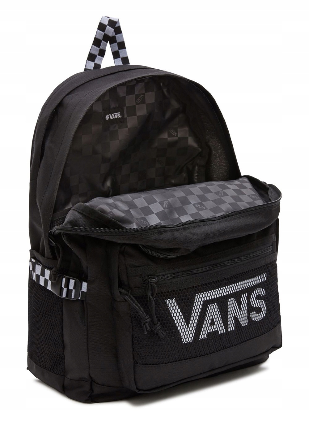 ✅ Чорний рюкзак із картатою ручкою та логотипом VANS під передньою сітчастою кишенею