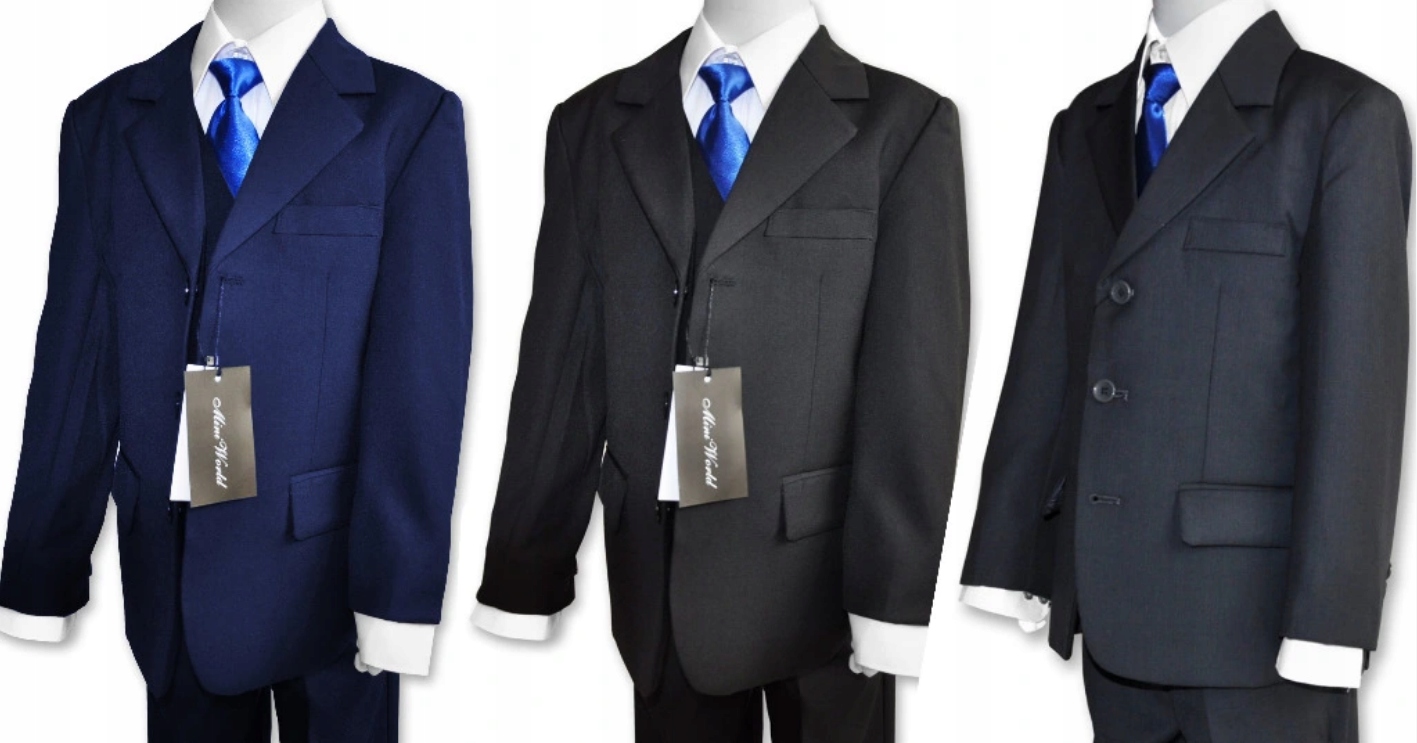 - Ми є виробником класичної лінії костюмів для хлопчиків і причастя, які пропонуються в повний розмір від 92 см до 176 см у трьох варіантах кольорів: чорний, графіт (сірий) і темно-синій.
