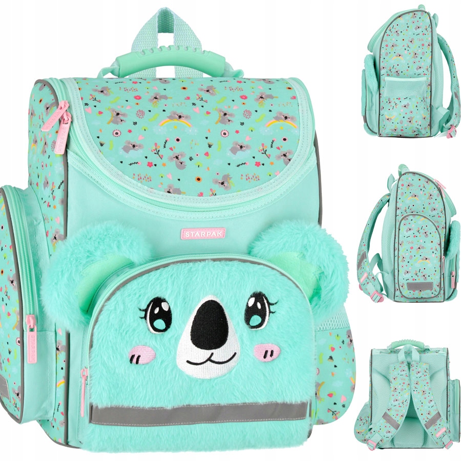Сумка з твердою мішком -одиночальниками оснащена системою ергономічної спини та рук, покритою губкою, забезпечуючи вільне потоку повітря та комфорт використання. Він має внутрішній організатор, який полегшує підтримку порядку. Крім того, шкільна сумка була обладнана просторою передньою кишені для блискавки та двома меншими бічними кишенями, одна з яких кріпиться блискавкою, а інша, виготовлена з сітки, ідеально підходить для пляшки з водою або напій з напоєм. Жорсткий, гума, покрита дном, захищає від бруду і вологи. Відбиваючі елементи були пришиті спереду та боків, щоб забезпечити безпеку. Шкільний мішок у кольорі келадону з плюшевими вставками, прикрашеними вухами коала. Зручна та функціональна шкільна сумка School Starpak з графікою з очима та вухами коала. Використання такого рюкзака - це чисте задоволення.
