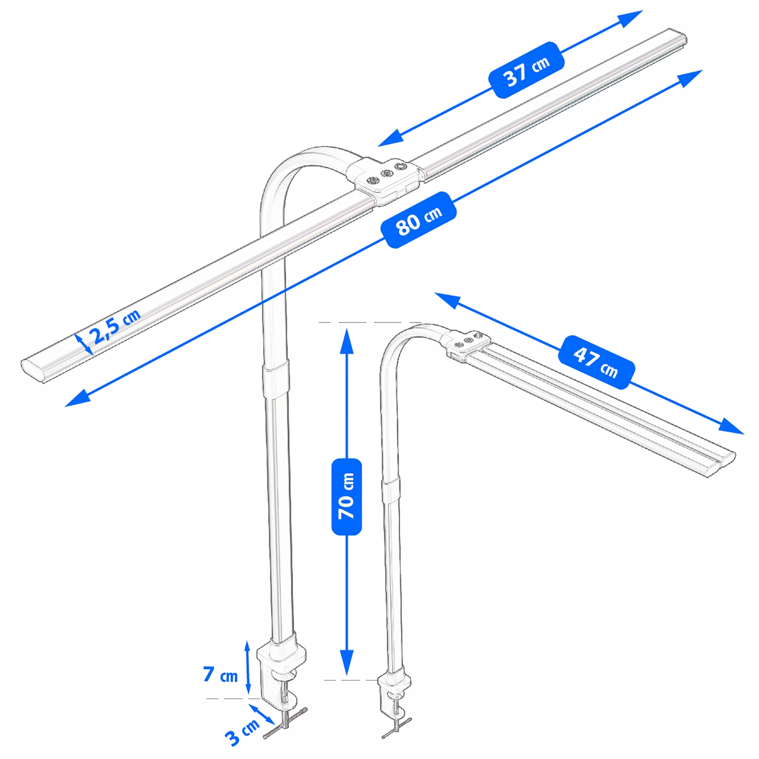 Сучасна біла настільна лампа забезпечить чудове освітлення для вашого робочого місця. Він також має додаткові функції , які сприятимуть організації простору . Градуси, що дозволяє вільно регулювати напрямок світла для ваших потреб. Лампа має затискач, який полегшує, наприклад, лампу, наприклад, до стіл.