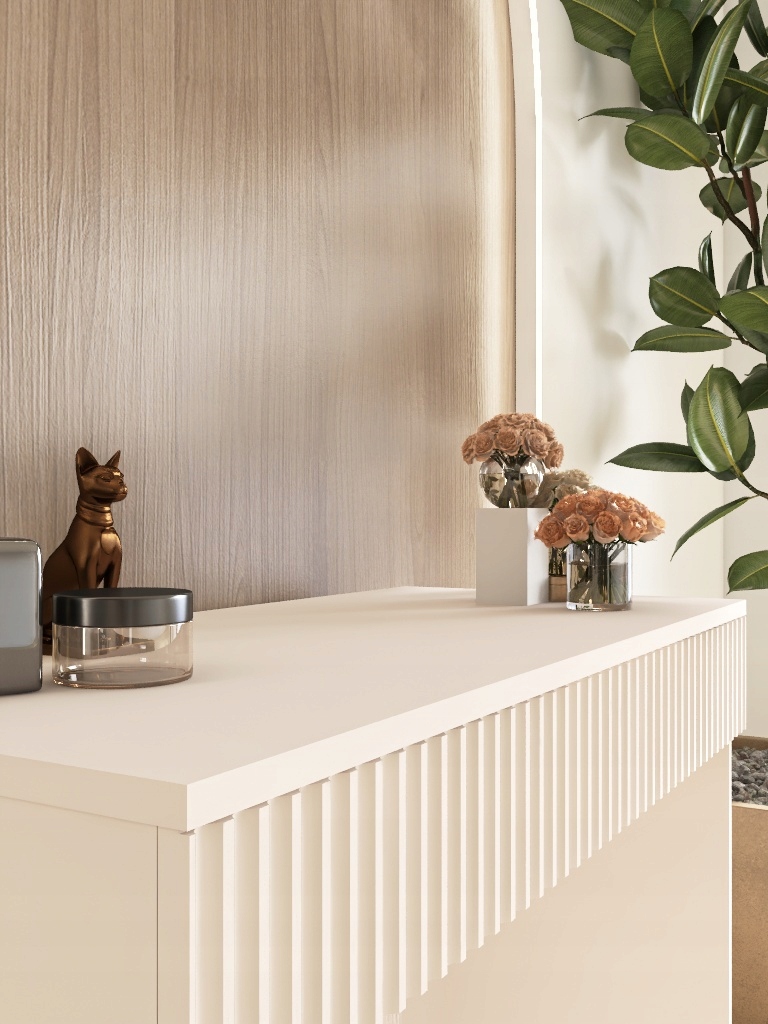 Стіл має елегантні рифлені фасади, які надають йому унікального характеру та сучасного вигляду. Тонкі вертикальні різці в дошці створюють ефект тривимірної структури, підкреслюючи сучасний стиль і високу якість виготовлення.