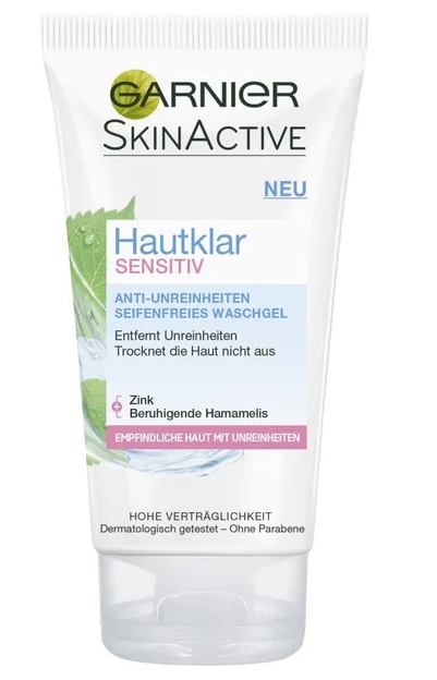Гель промивання Гарньє пристосований до чутливої шкіри з домішками і поєднує високу ефективність у делікатній формулі. Формула з цинком інтенсивно очищає і явно покращує пори, не висихаючи шкіру. Формула з Віргінським Окзар заспокоює на шкірі.
