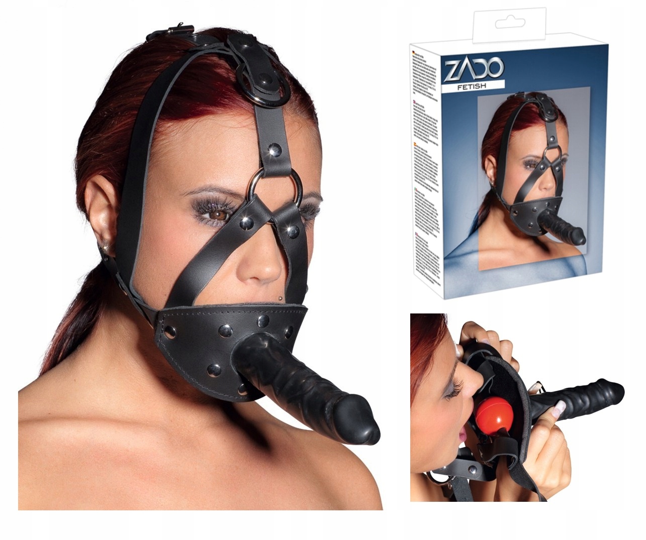 Оснащений внутрішнім ротовим кляпом і чорним фалоімітатором 13 см із жорсткого латексу.