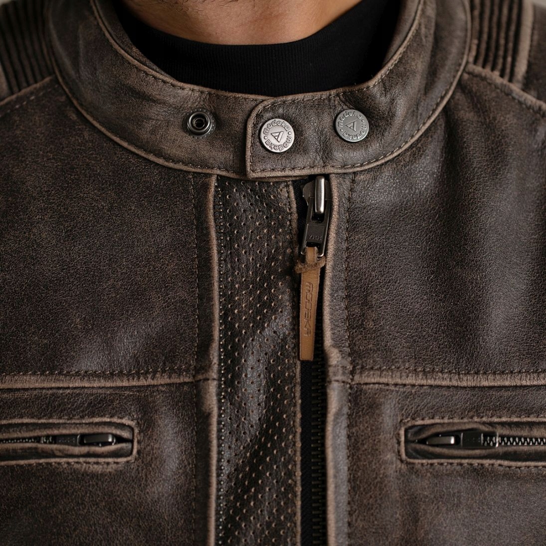 оснащений плечовими та ліктями протектори 2 (CE EN 1621-1: 2012 та кишеню для спеціальних захисників. Vintage-style leather
