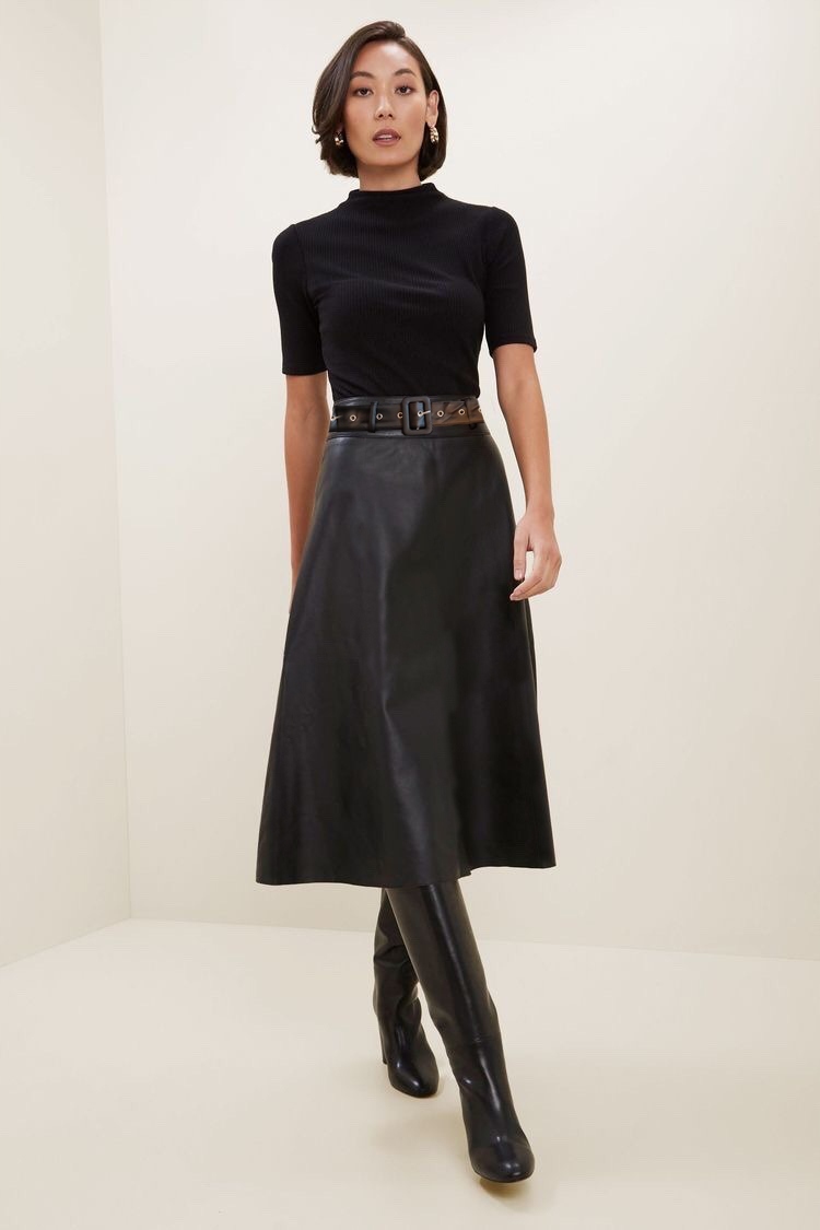 Шкіряна розкльошена трапецієподібна спідниця з екошкіри