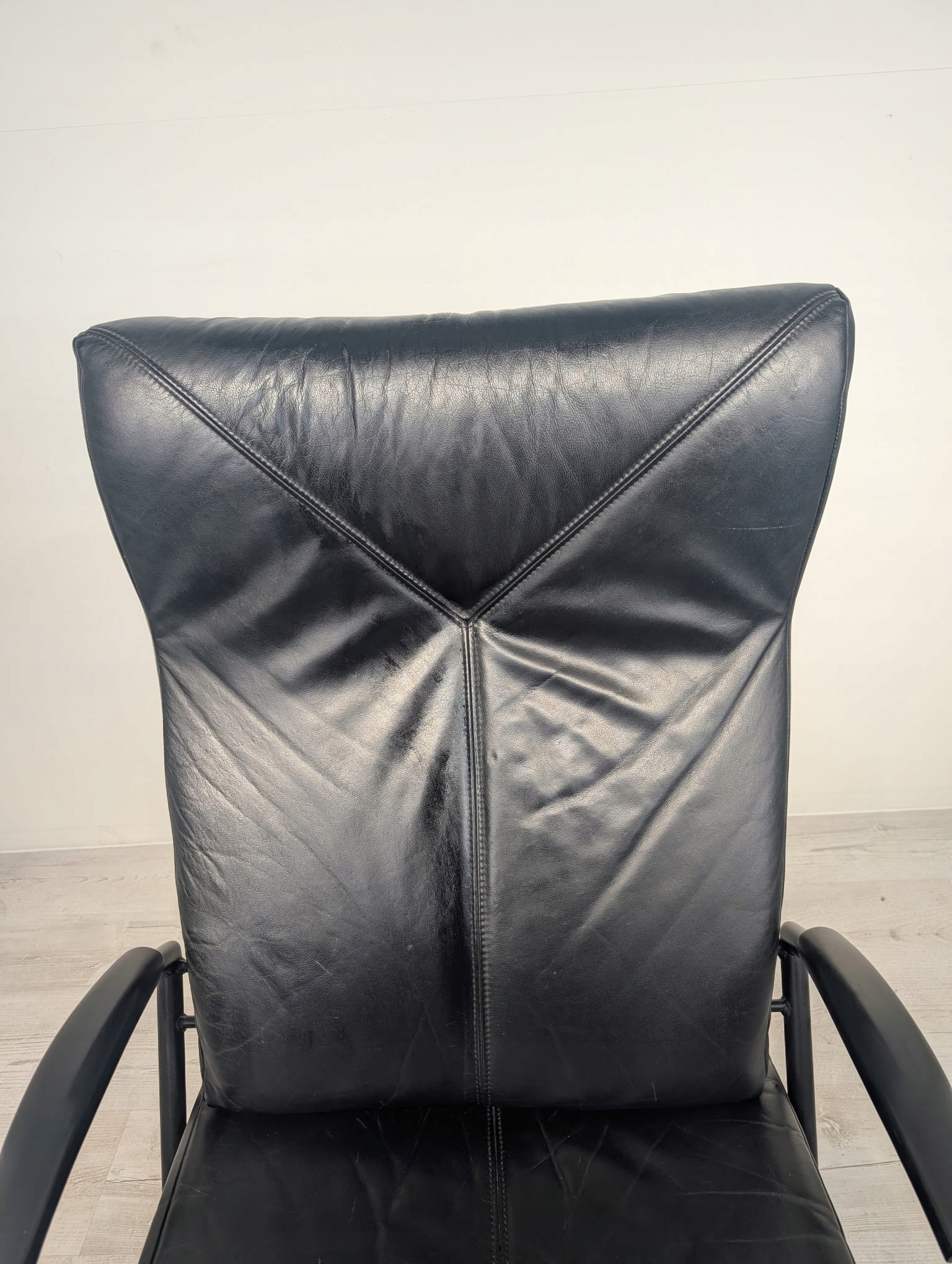 Шкіряний шезлонг на масивному металевому каркасі, оббитий чорною натуральною шкірою.