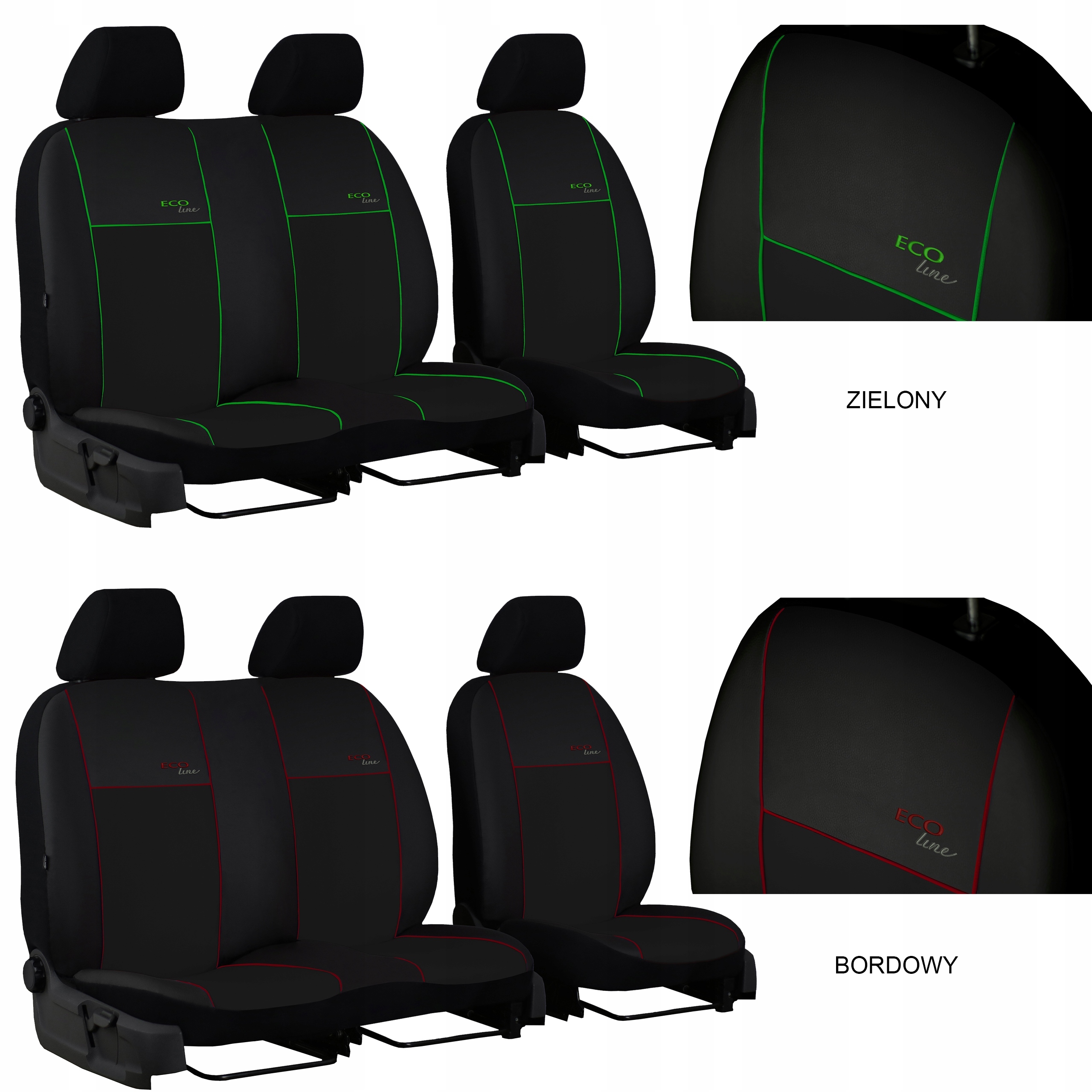 Наші чохли ECO LINE повністю покривають сидіння. Передня частина (спинка і сидіння) виконана з екологічної шкіри. Спинка, підголівники і бічні частини чохлів виготовлені з міцного чорного матеріалу. Завдяки цьому рішенню оригінальна оббивка сидінь захищена від пошкоджень і бруду в найбільш відкритих місцях.