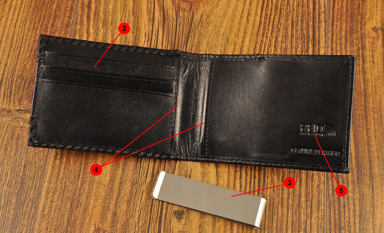 Дуже якісна шкіра гарантує дуже тривалий час використання. Футляр має знімну кліпсу, яка дозволяє зберігати банкноти