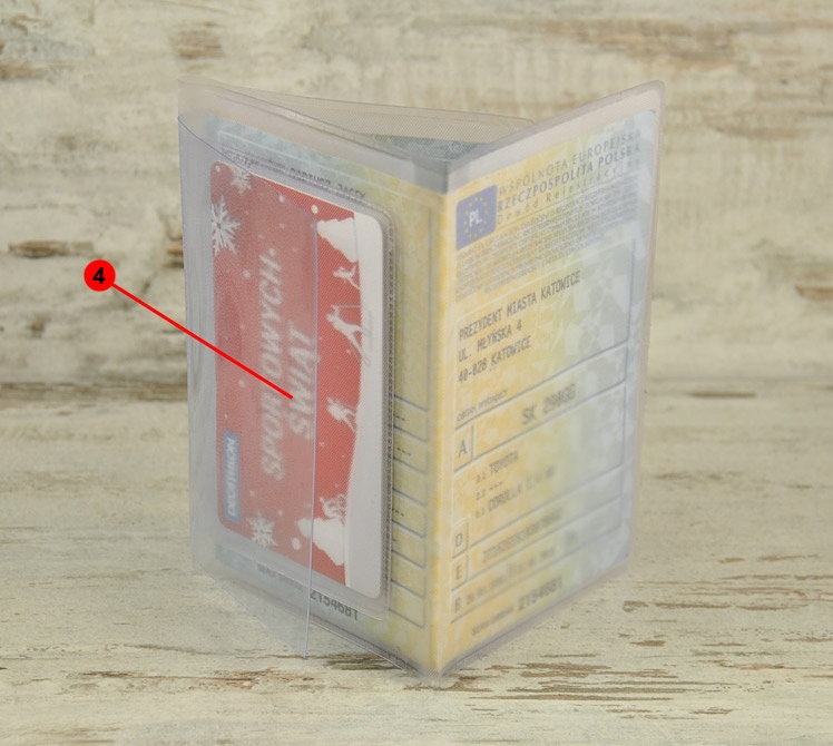4 - знімний футляр для свідоцтва про реєстрацію автомобіля та два місця для банківської картки або документів цього формату, ID-картки, водійських прав тощо.