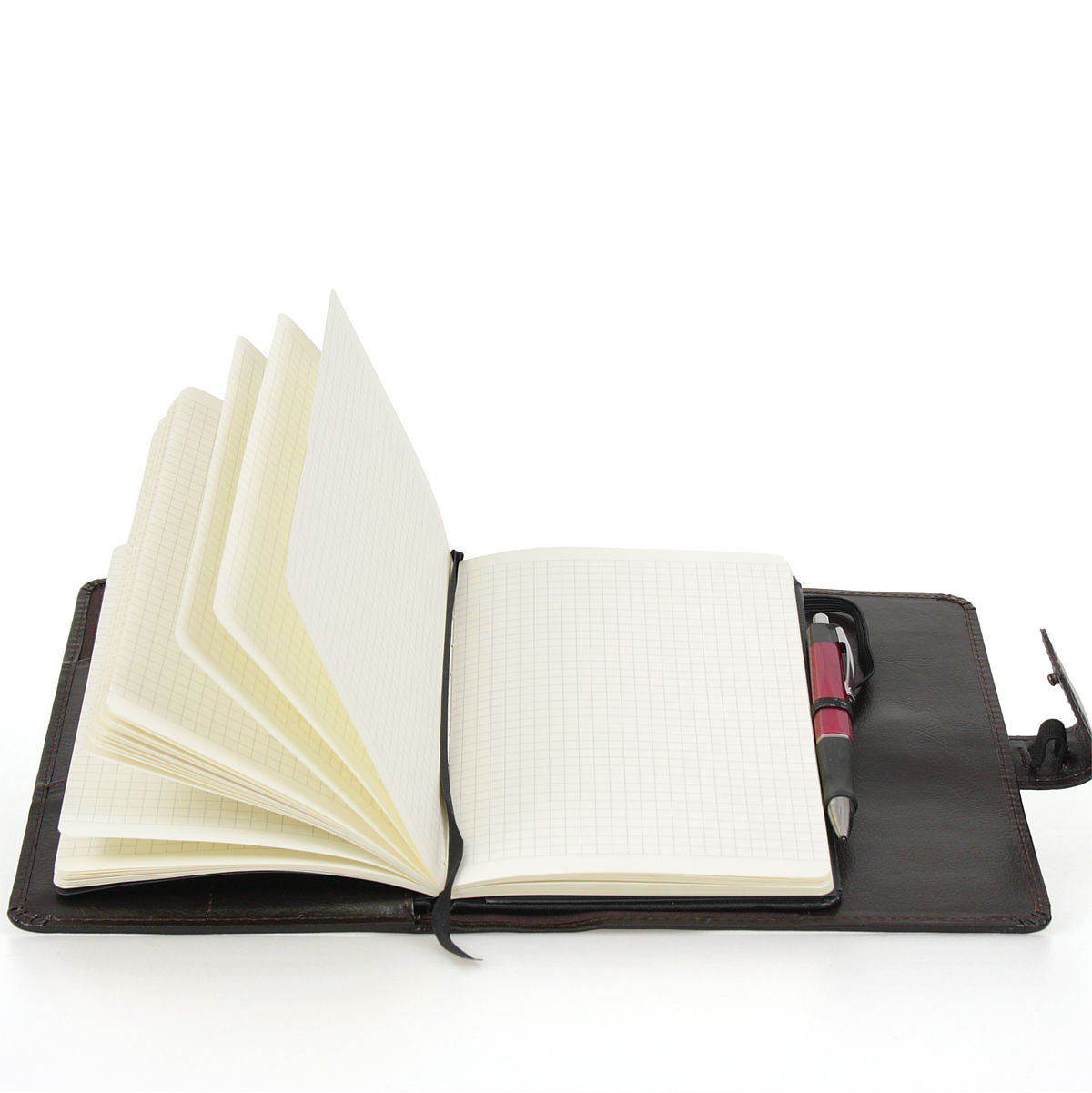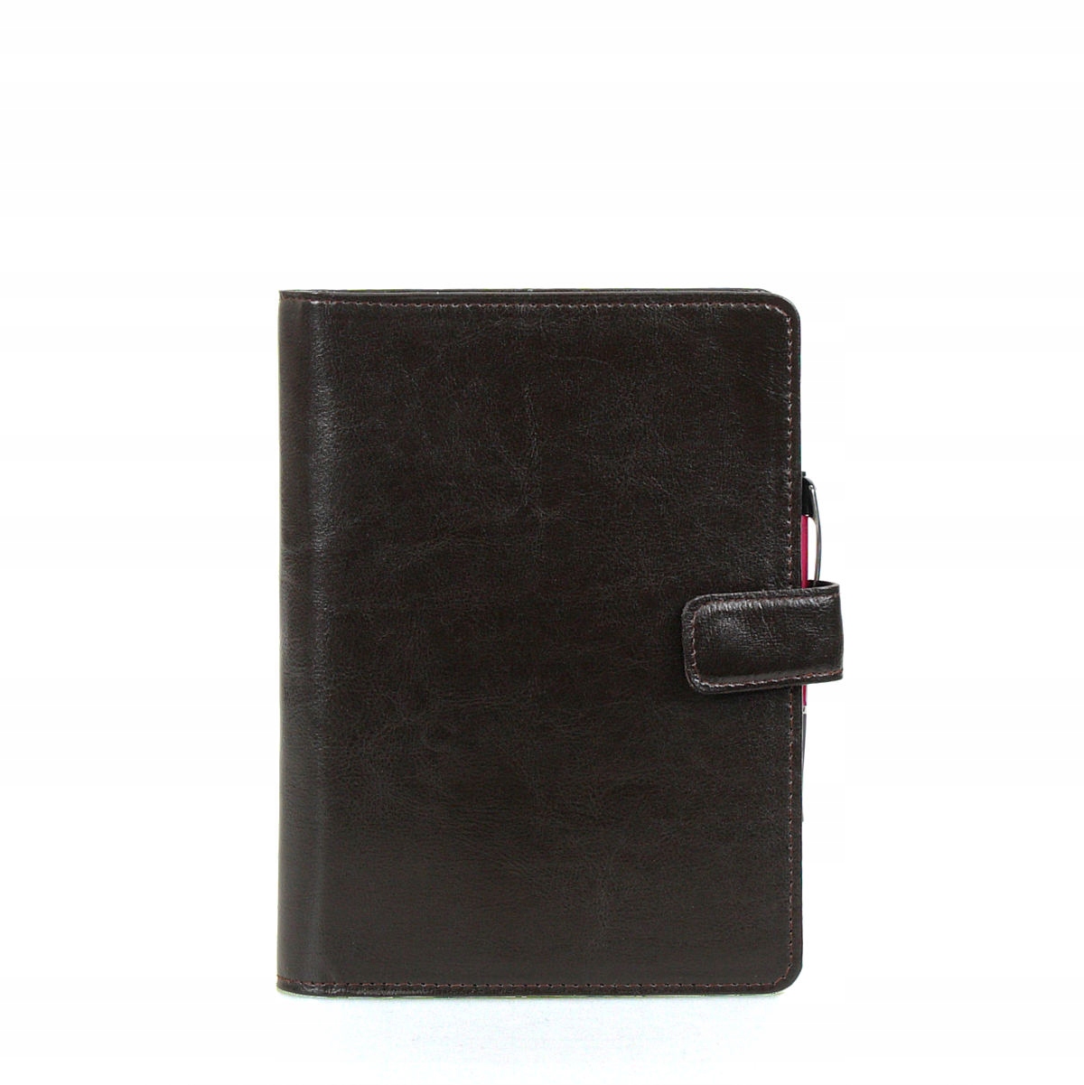 Обкладинка, футляр для календаря, блокнота або книги. Формат А5. Польський виріб з натуральної темно-коричневої шкіри. Всередині є кишені для візиток і карток. Він оброблений підкладкою відповідного кольору. Застібка на клапан із застібкою. Тримач для ручок під клапаном.