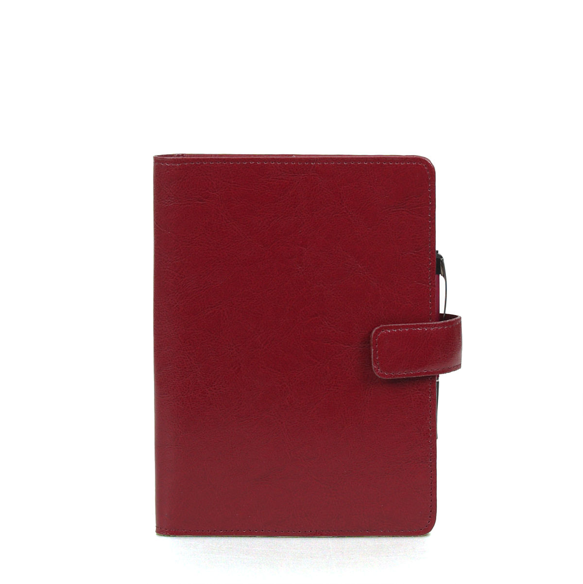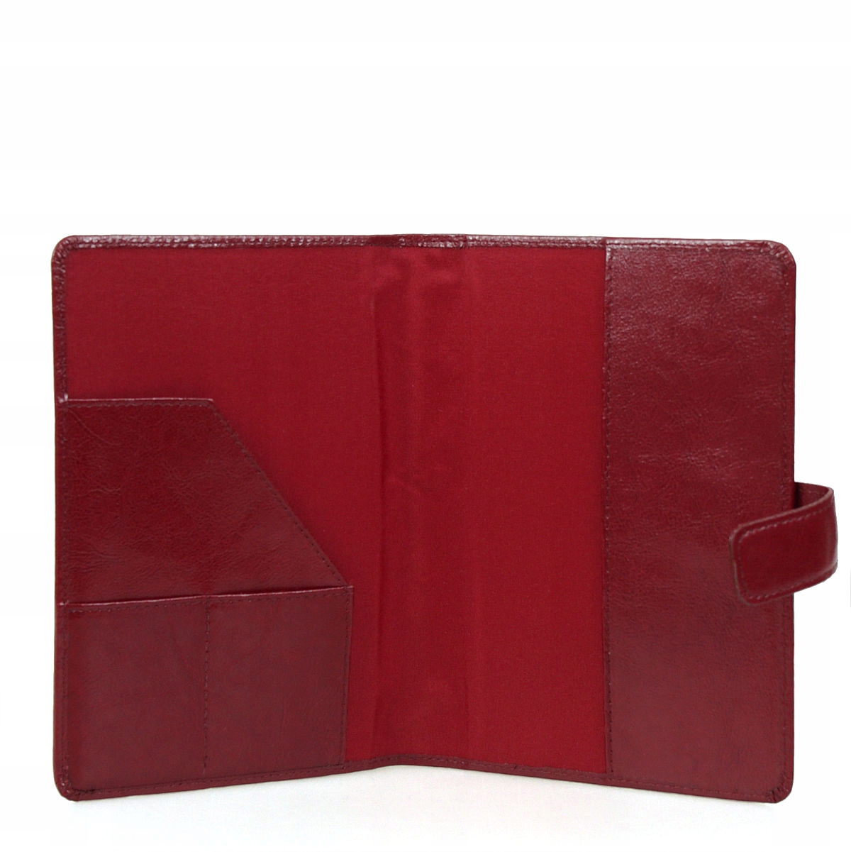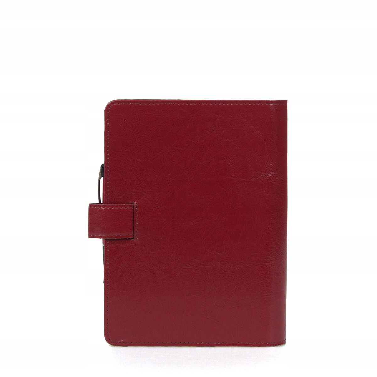 Обкладинка, футляр для календаря, блокнота або книги. Формат А5. Польський виріб з натуральної шкіри бордового кольору. Всередині є кишені для візиток і карток. Він оброблений підкладкою відповідного кольору. Застібка на клапан із застібкою. Тримач для ручок під клапаном.