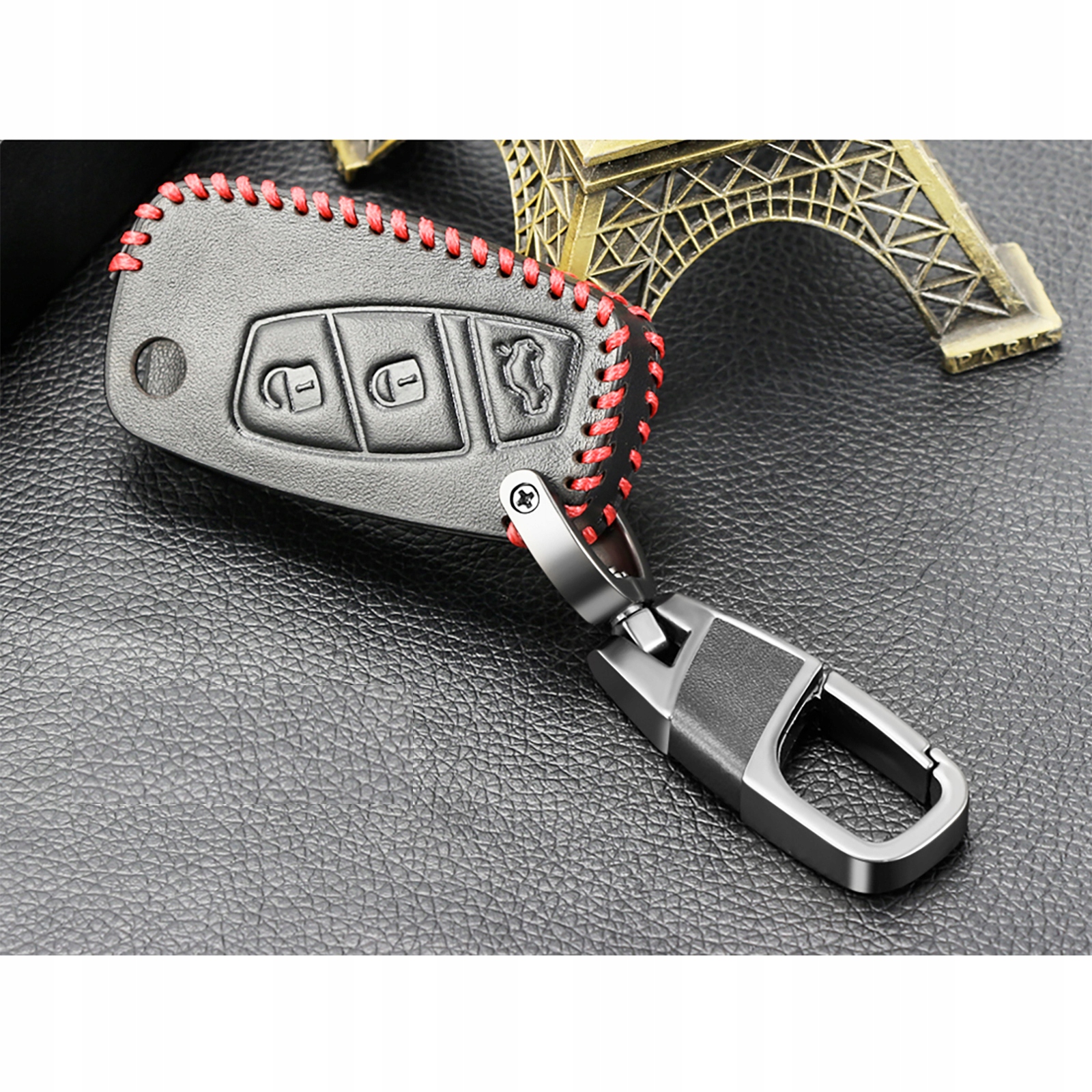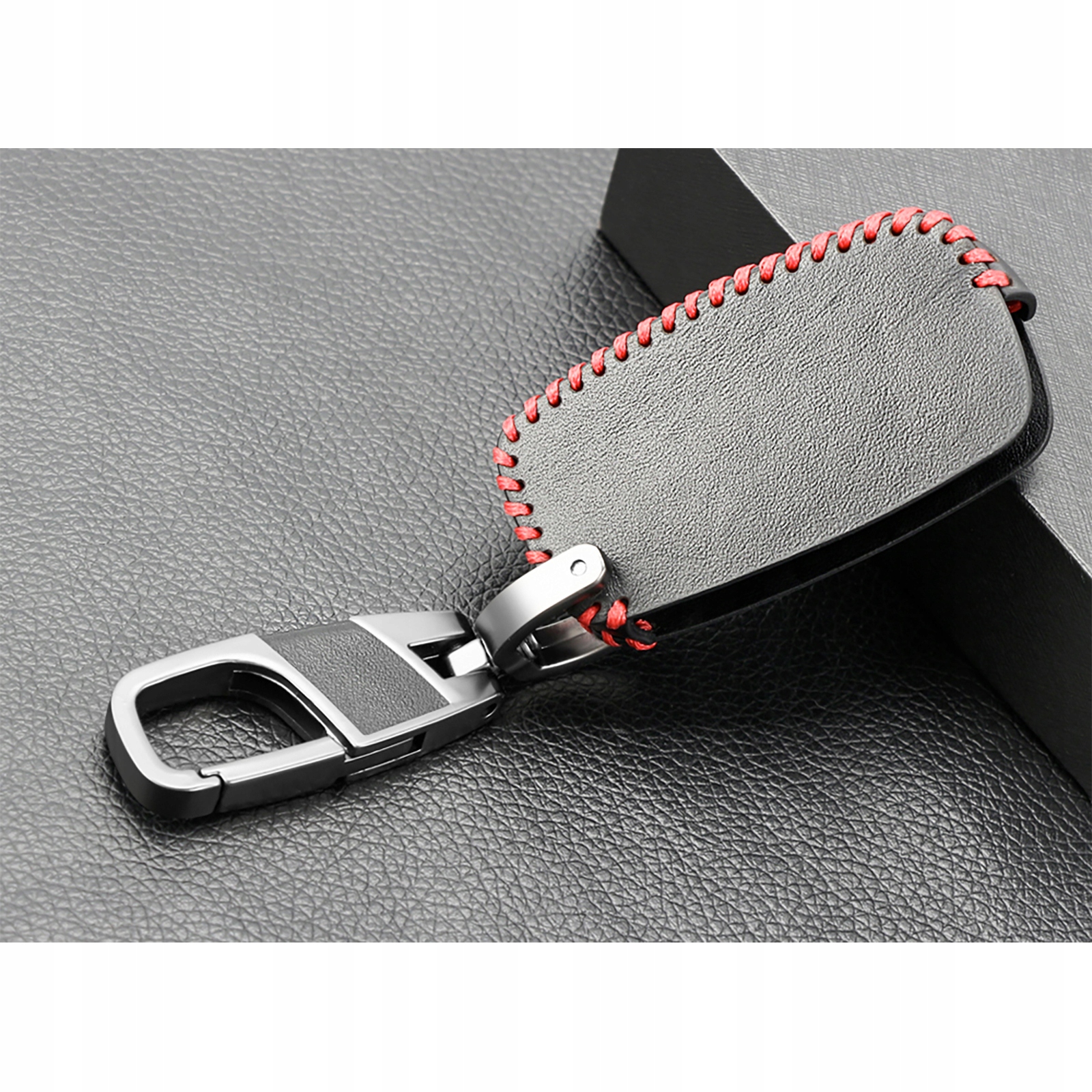 Ми пропонуємо зшиті вручну футляри для ключів усіх марок і моделей легкових автомобілів тощо. Ключі виготовлені з натуральної чорної шкіри, прошиті товстою червоною ниткою. Кожен футляр оснащений практичним сталевим карабіном, покритим лаком титанового кольору.