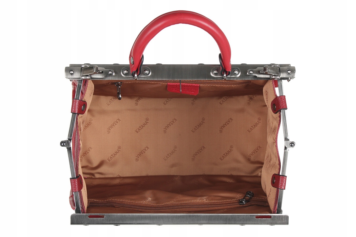 Інтер'єр оброблений фірмовою жакардовою підкладкою з бічними кишенями для дрібниць і блискавками. Сталева планка, що закриває багажник, є ретро-патентом для широкого зручного доступу до просторого салону. Це важлива особливість для медичного використання стовбура. У нас також є можливість закрити мішок на замок або опечатати його. Шкіряна ручка, скріплена сталевою фурнітурою, забезпечує довговічність при підвищених навантаженнях. Металеві ніжки захищають дно багажника від пошкоджень і бруду. Зовні, ззаду сумки, додаткова кишеня для підручних речей.