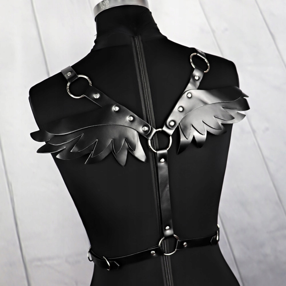 Харнес — кокетливе доповнення до еротичної білизни з крилами на спині. Дуже легко надягати, просто застібніть їх, а потім пристосуйте до тіла за допомогою пряжок. Ремінці з приємної та м'якої синтетичної шкіри. Виріб універсального розміру і завдяки регулюванню ідеально сидить на різних фігурах, додає впевненості в собі та підкреслює її найбільші переваги. Шлейка складається з красивих лямок, що підкреслюють тіло, додають жіночності та сексуальності. Широкі пояси інтригують і гіпнотизують, змушуючи жінку почуватися надзвичайно чарівною.