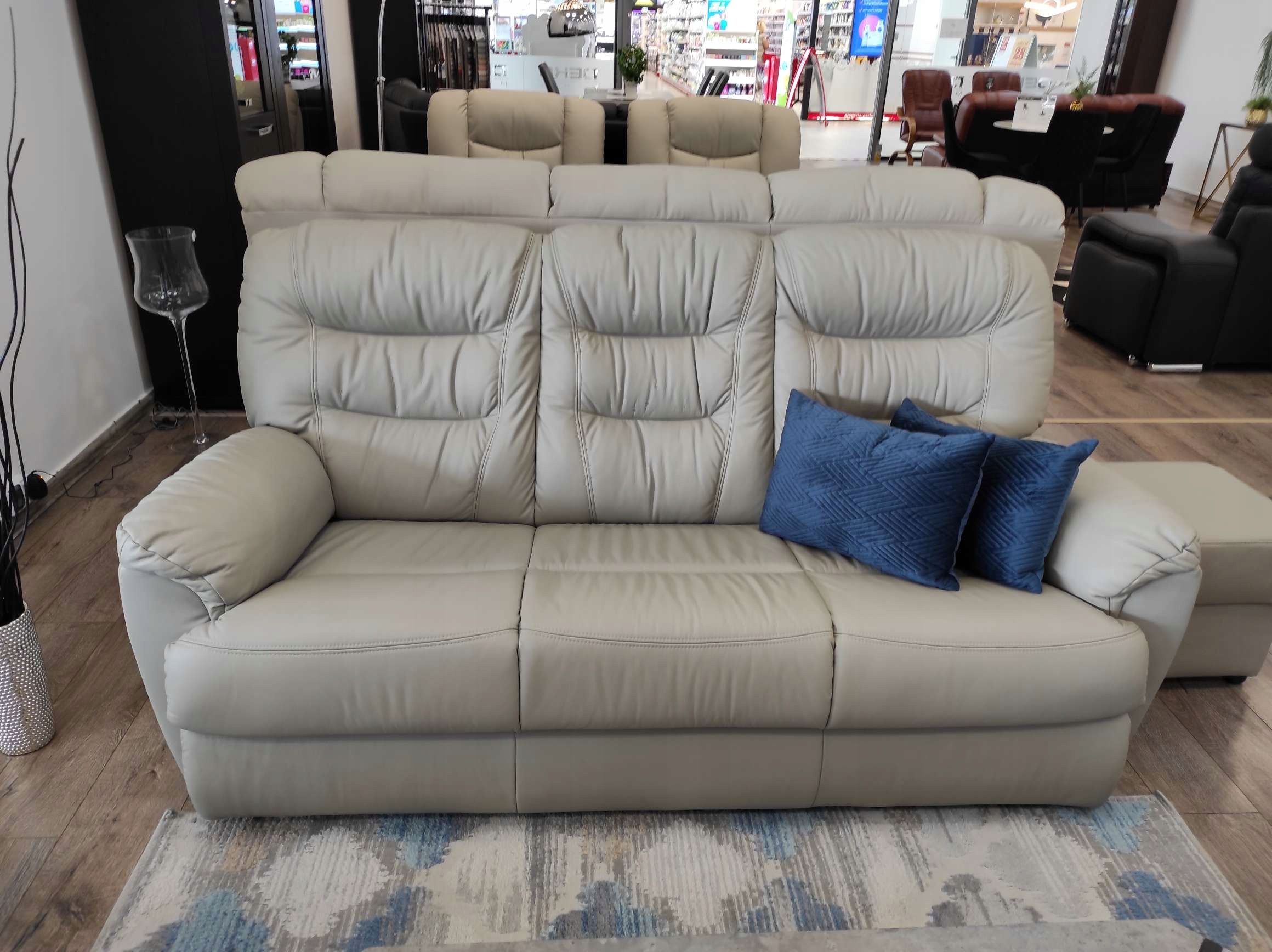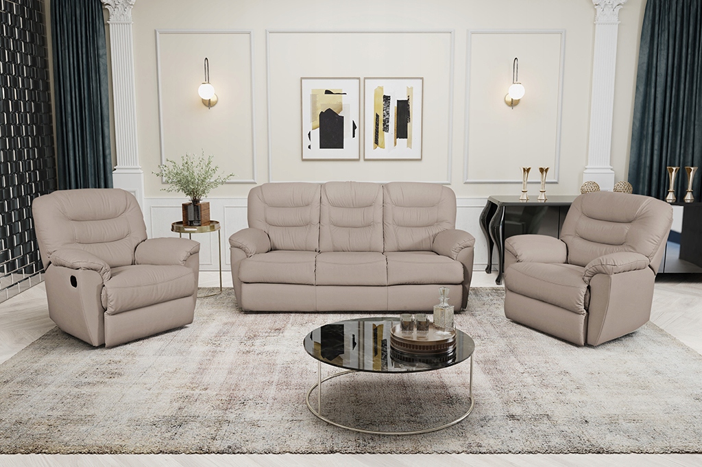Пропонований комплект 3+1+1 без функцій - натуральна шкіра + бортики, спинка і низ меблів екологічна шкіра.