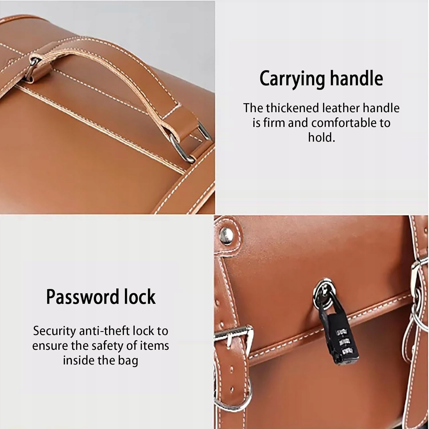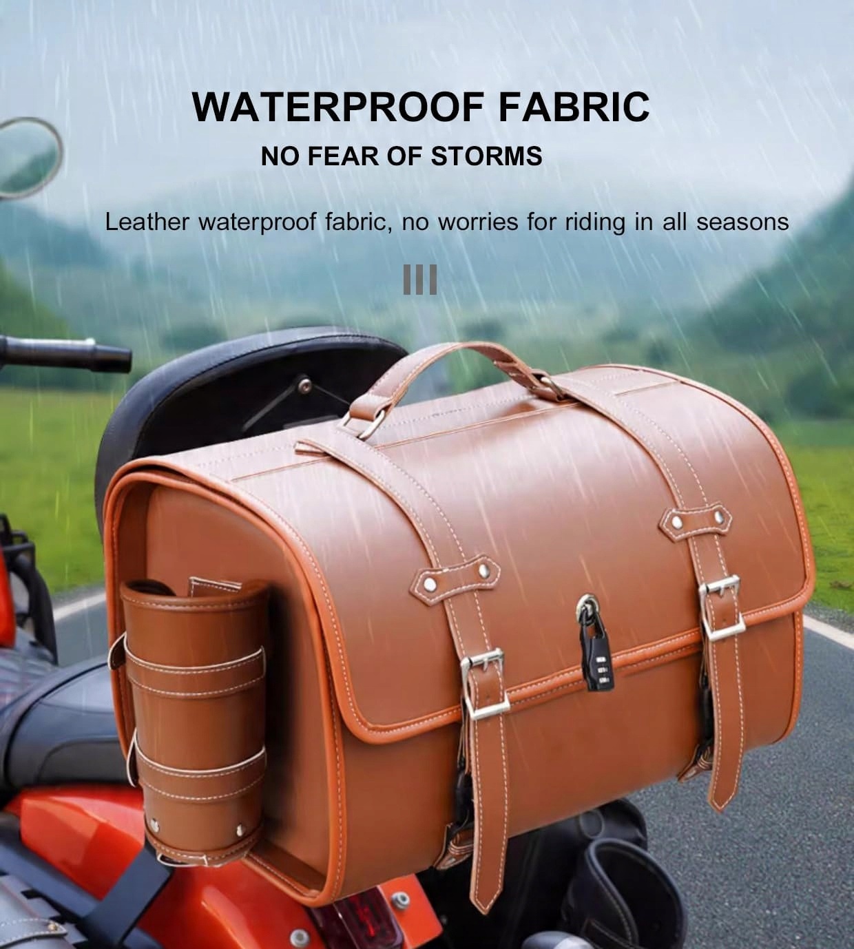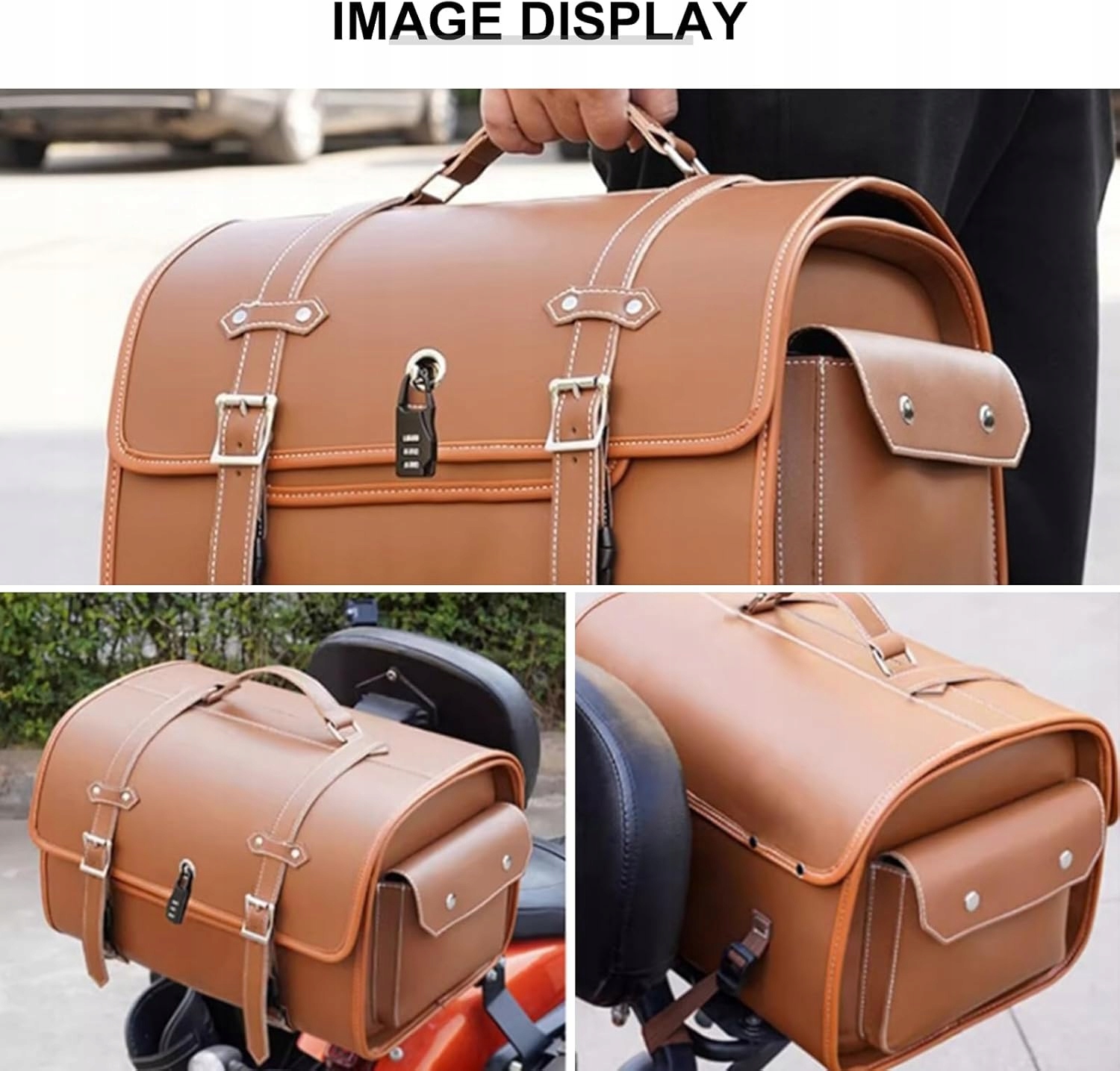 - Сумка виготовлена з коричневої екологічної шкіри і має класичний вигляд. Він оснащений смужками та пряжками, які дозволяють безпечно кріпити до мотоцикла.