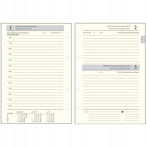 Календар містить багато корисної інформації, наприклад, відстані, інформацію про європейські країни, польські номерні знаки, часові пояси, календар імен, перерахунок одиниць вимірювання, телефонні коди (міжнародні, міжміські). Щоденний календар, замшевий папір, коричневі кольори друку.