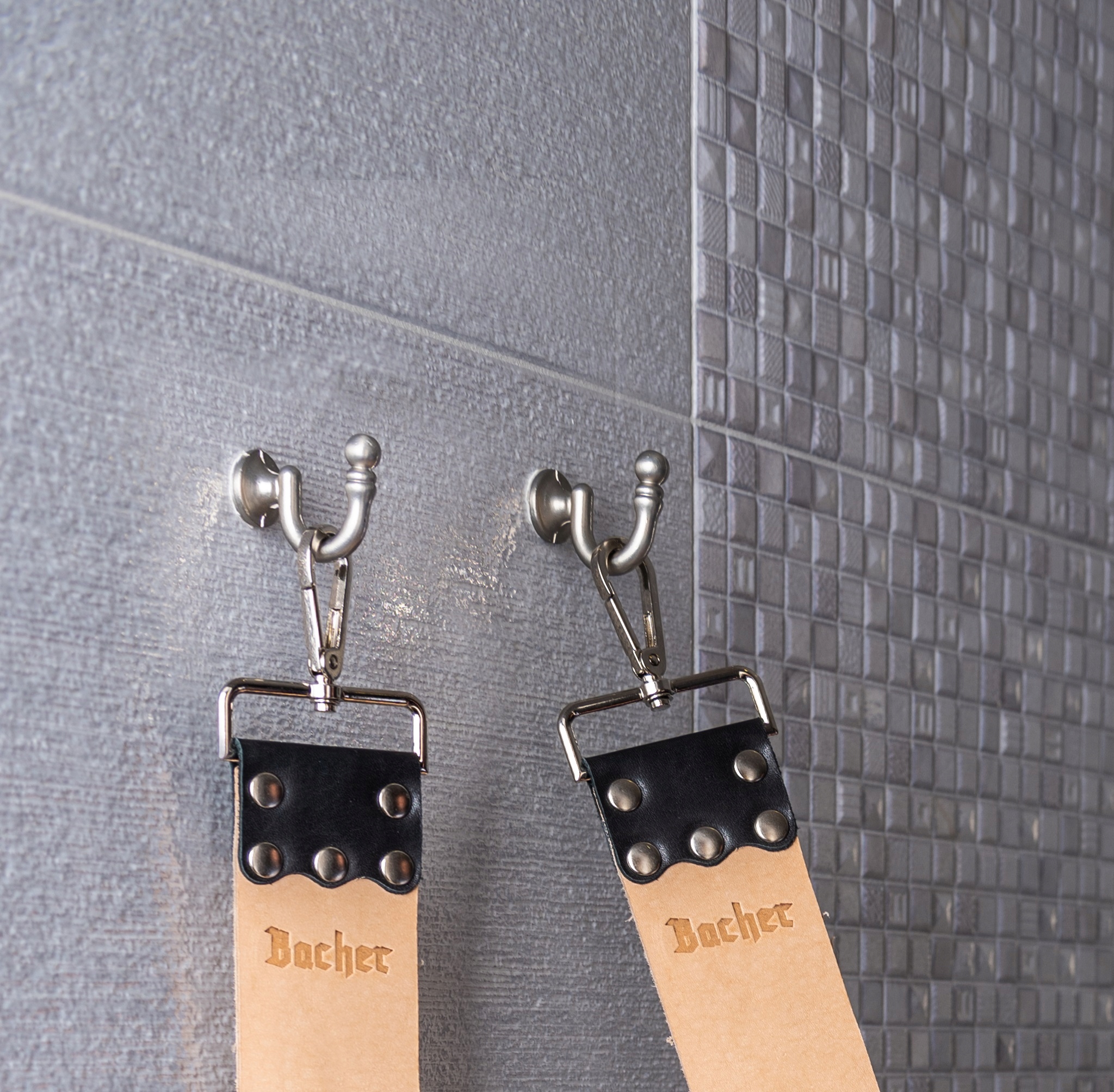 Пояс оснащений з одного бокузручною ручкою, а з іншого боку карабіном для підвішування на гачок. Карабін також дозволяє прикріпити ремінь будь-де, включно з ременем брюк. У комплект входить гачок для кріплення на стіні. Довжина і ширина ременя забезпечують зручне сточування бритви, а нікельований карабін і ручка дозволяють зручно кріпити ремінь і належний натяг. Усе це упаковано в оригінальну тверду обкладинку з логотипом Bacher, що забезпечує безпечне зберігання та транспортування.
