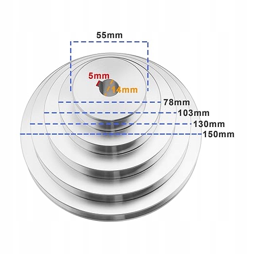 - [5-шарове токарне колесо] Токарне колесо має 5 шарів, зовнішній діаметр становить 55 мм, 78 мм, 103 мм, 130 мм і 150 мм, отвір: 14 мм.