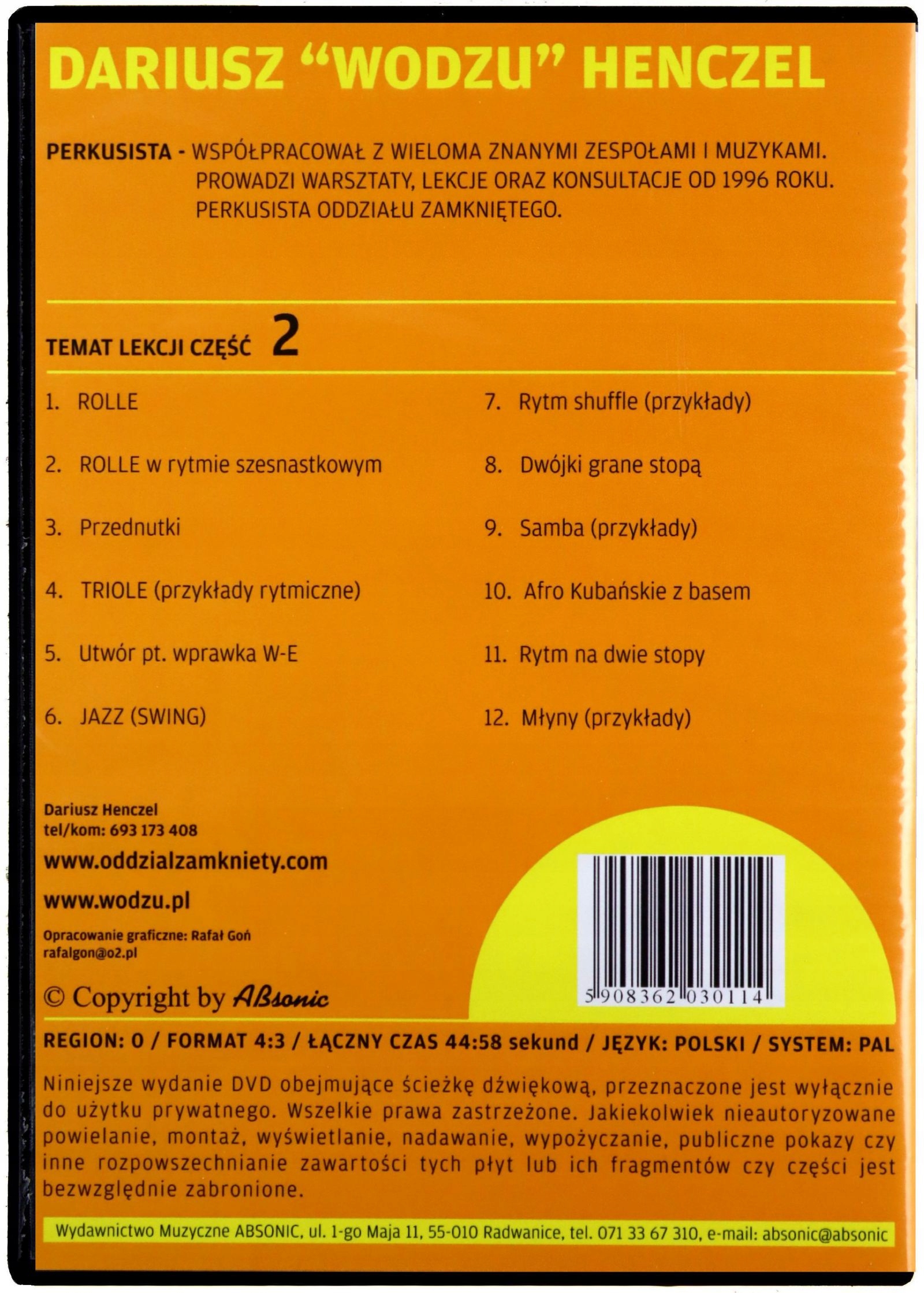 Друга частина чудового курсу для барабанщиків, як початківців, так і тих, хто вже грає, які хочуть поглибити свою техніку та знання барабанів. Курс підготовлено у вигляді DVD-фільму, який дозволяє на власні очі побачити, як грати ту чи іншу вправу чи ритм. Завдяки цьому навчання йде набагато швидше, ніж, наприклад, на книжкових курсах. Чудове рішення полягає в тому, що автор спочатку показує все в уповільненій зйомці, щоб ви могли точно бачити, в якому порядку і куди потрібно бити. Звичайно, все коментується, що є величезною допомогою. Автор курсу – Даріуш «Водзу» Хенцель (барабанщик Закритої філії з 1996 року).