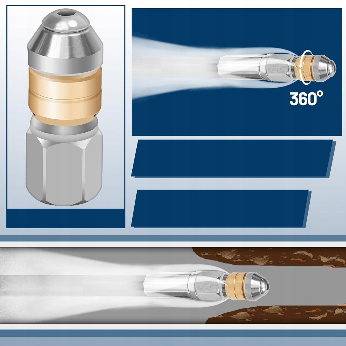 ✅ обертова насадка】 3 отвори насадки розпорошують рідину на засмічену трубу і переміщують насадку через трубу. Насадка можна легко розмістити в дренажних трубах та каналізаційних лініях. Забезпечує рівномірне очищення та промивання бруду.