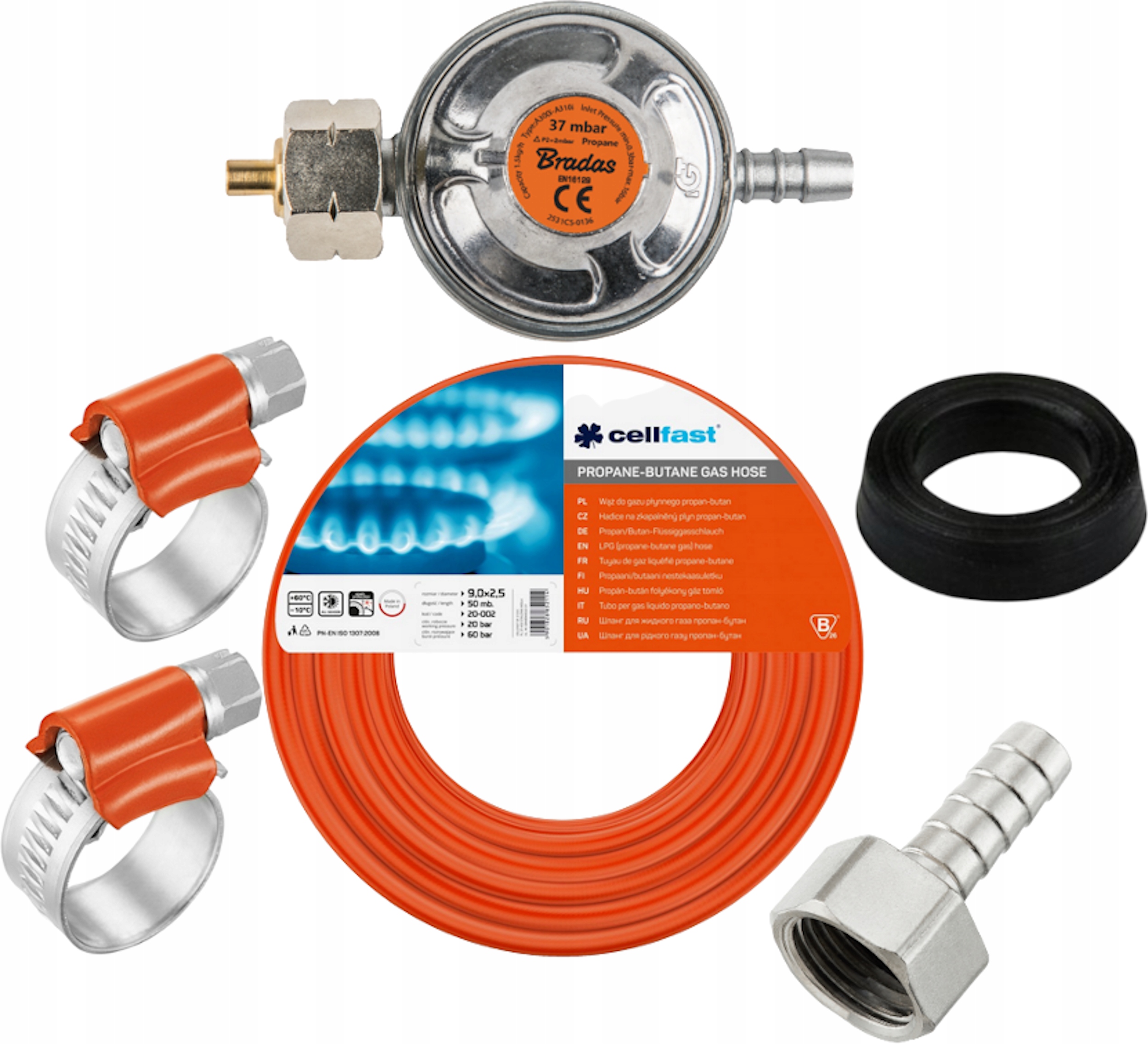 ШЛАНГ 2 Метри+РЕГУЛЯТОР ГАЗОВОГО БАЛОНА+ПРОКЛАДКА+ХОМУТИ