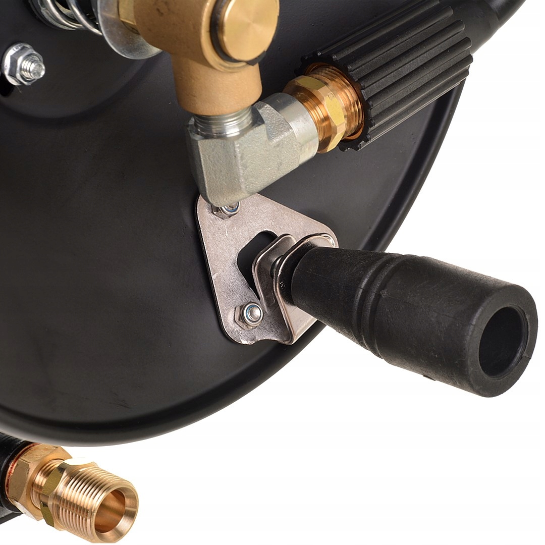 Виготовлений з металу найвищої якості з порошковим покриттям, має поворотне з'єднання і фіксатор від скочування. Фіксатор запобігає небажаному розмотуванню шланга, забезпечуючи безпечну роботу. Котушка розрахована на шланг довжиною до 20 м. Котушка оснащена ручкою-основою для настінного кріплення, шайбою тощо та рукояткою для перемотування шланга.