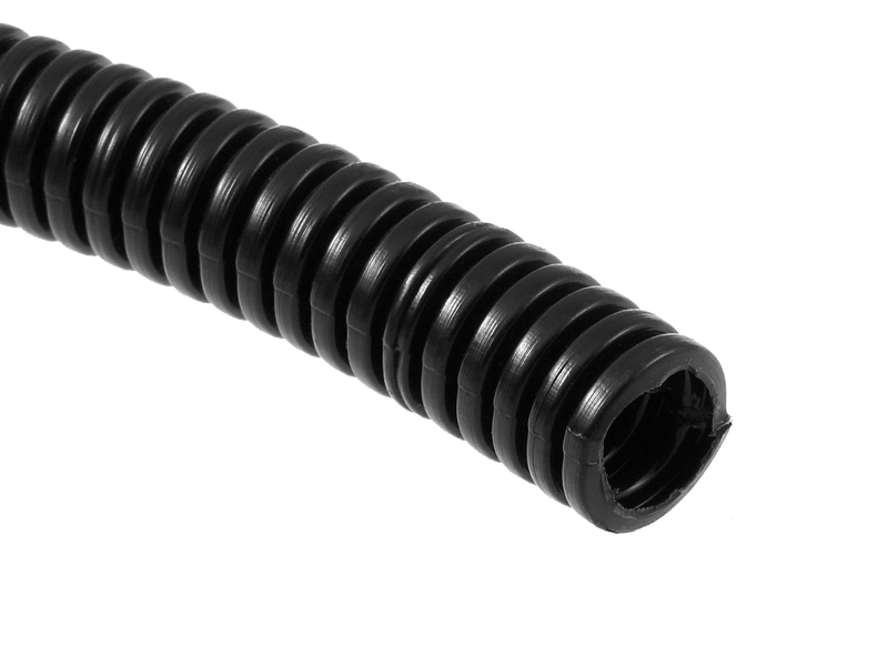 Поздовжньо розрізана гофрована труба з пластику. Продукт підходить для захисту електричних кабелів.