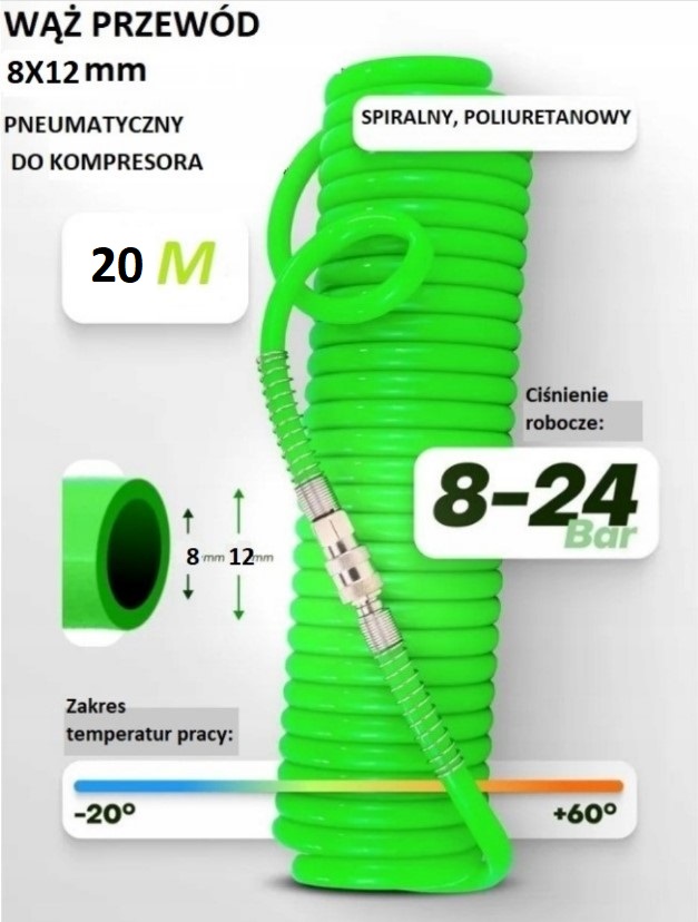ШЛАНГ 8x12ММ 20М СПИРАЛЬНИЙ ПОЛІУРЕТАНОВИЙ ПНЕВМАТИЧНИЙ ШЛАНГ ДЛЯ КОМПРЕСОРІВ КОРМИ.