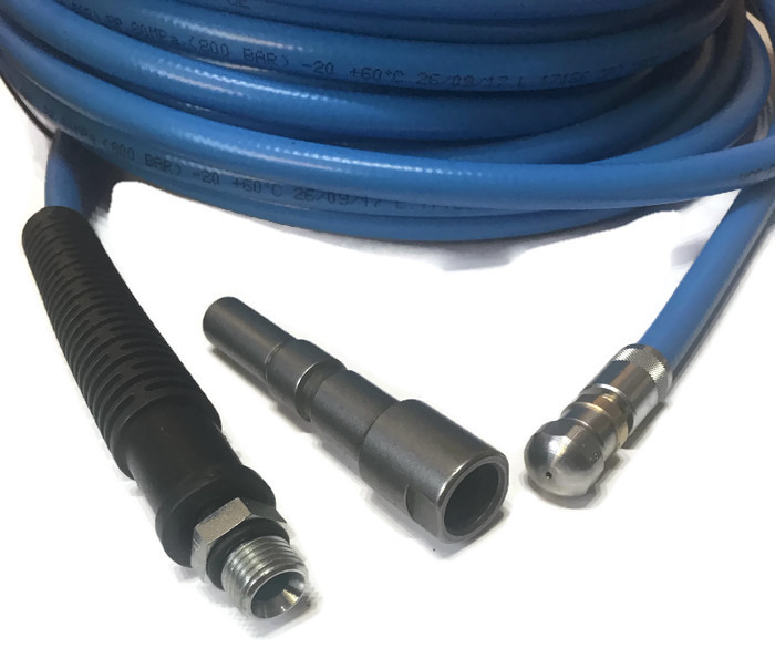 Цей шланг має зменшений зовнішній діаметр і вкорочену затискну муфту з боку сопла, що робить його ідеальним для очищення колін труб малого діаметру.