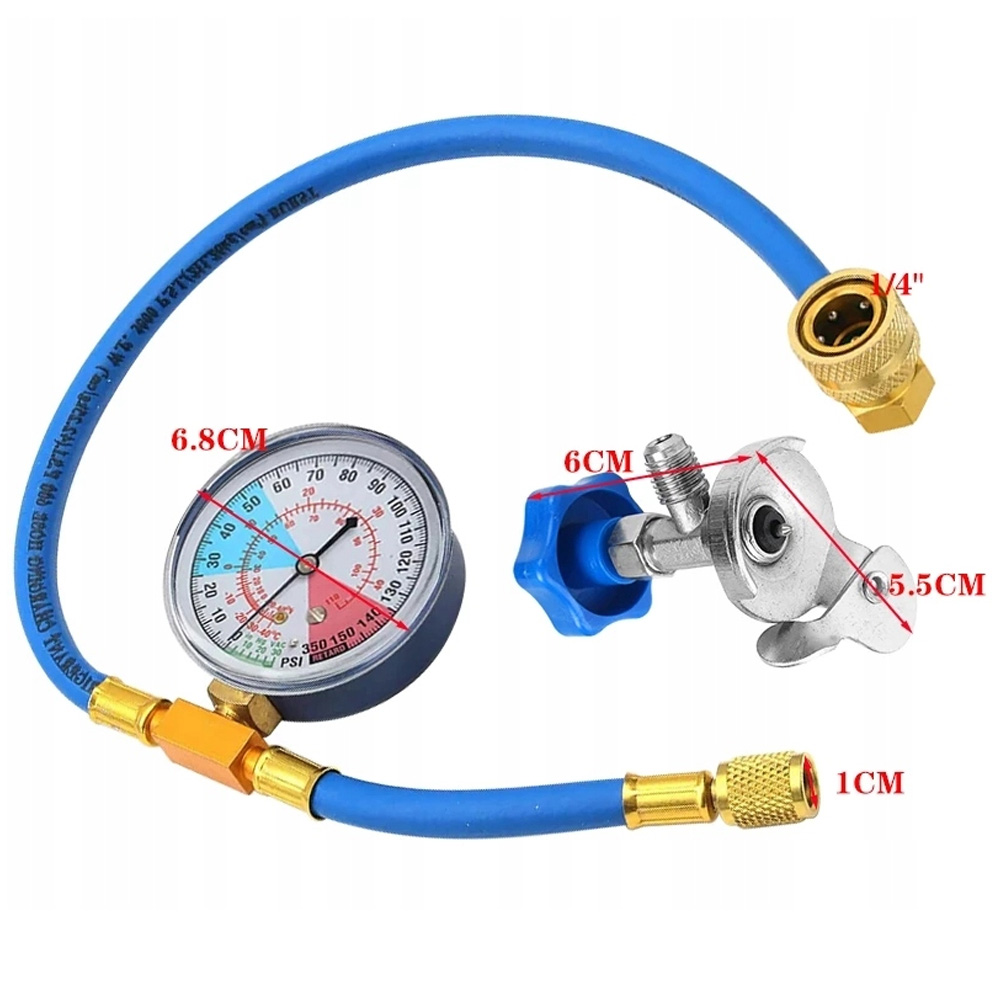 ✅Загальна довжина: 50 см/20 дюймів, кран для ємності з холодоагентом: фітинг 1/2" acme, з’єднувач шланга: 1/4" SAE, Шкала манометра: 0–350 PSI, показання температури: ℉