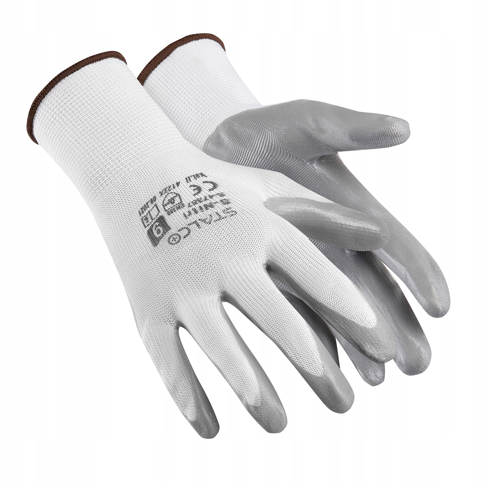Поліамідні рукавички S-Nitri STALCO виготовлені з поліамідної тканини 13 г. Цей матеріал надає їм гнучкості та захищає від травм. З внутрішньої сторони руки є нітрилове покриття. Він створює захисний шар від вологи та рідких речовин, а також полегшує утримання дрібних та слизьких предметів у руці. Рукавички білі з сірим покриттям.