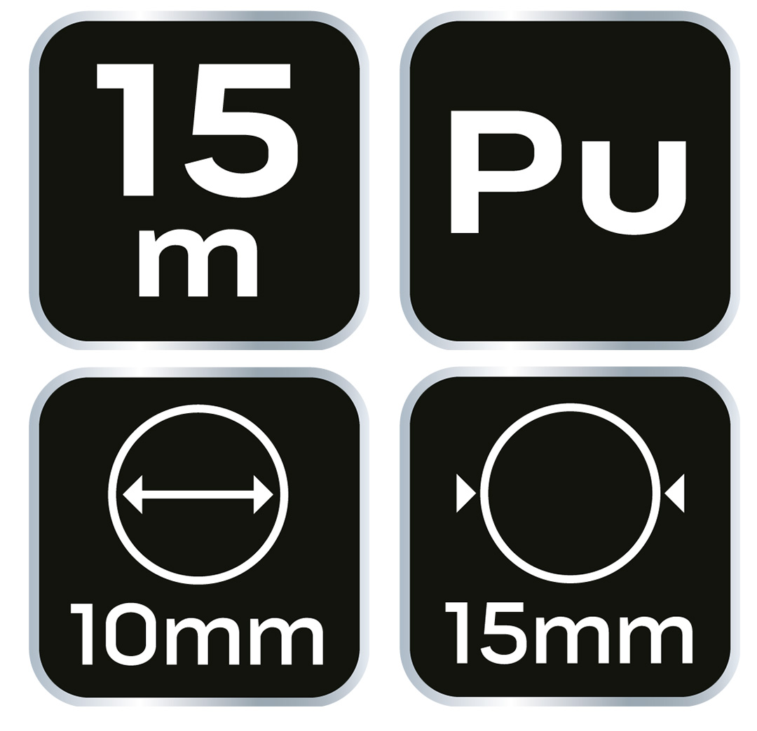Спіральний напірний шланг NEO (арт. № 14-076) з високоякісного поліуретану (ПУ), зовнішній діаметр 15 мм, внутрішній діаметр 10 мм, довжина 15 м. Максимальний робочий тиск 10 бар. Кабель можна використовувати в діапазоні температур від -10 до +35°С. Роз'єми в комплекті. Торгова марка NEO відповідає очікуванням професіоналів.