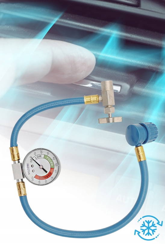 Для завершення системи кондиціювання повітря необхідний шланг із манометром. Після підключення до клапана низького тиску ми отримаємо показання тиску на манометрі. Він придатний для багаторазового використання, тому не забруднює навколишнє середовище.