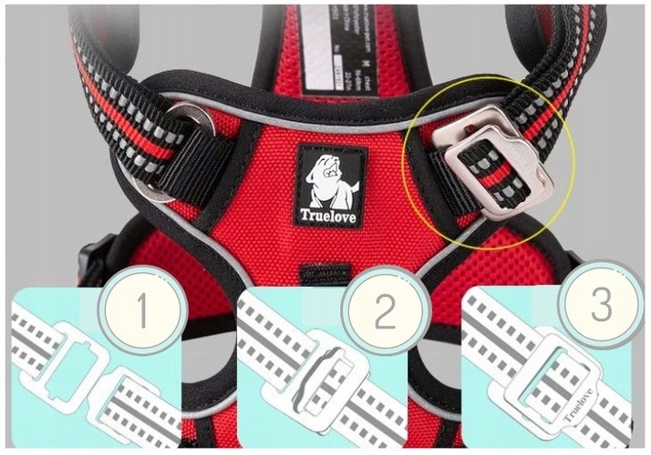 - Шлейка регулюється по окружності на висоті грудей, тому ми можемо ідеально підігнати її до нашої собаки.