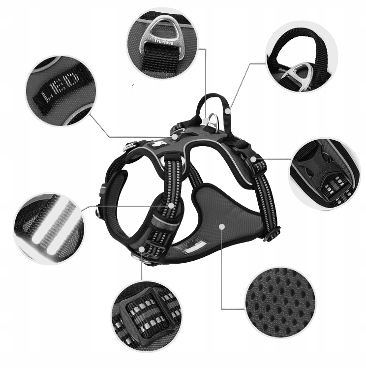 - Шлейка регулюється по окружності на висоті грудей, тому ми можемо ідеально підігнати її до нашої собаки.