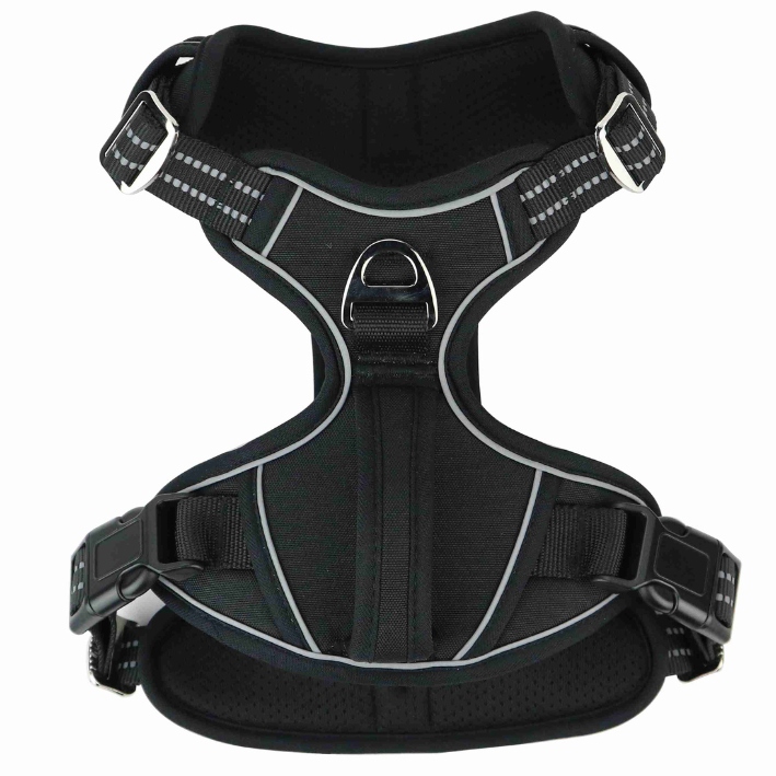 - обладнаний з двома точками кріплення повідка: ззаду на спині собаки та спереду на грудях собаки.
