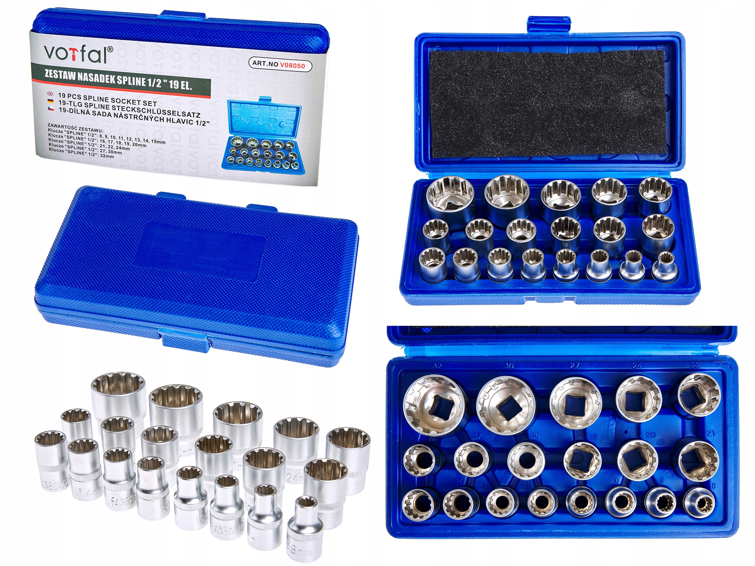 Практичний набір гайкових ключів SPLINE із торцевою головкою 1/2" у пластиковому футлярі. Набір містить 19 предметів популярних розмірів. Головки призначені для професійного використання. Вони виготовлені з міцної хром-ванадієвої сталі (CrV 50bv30+ 6150).