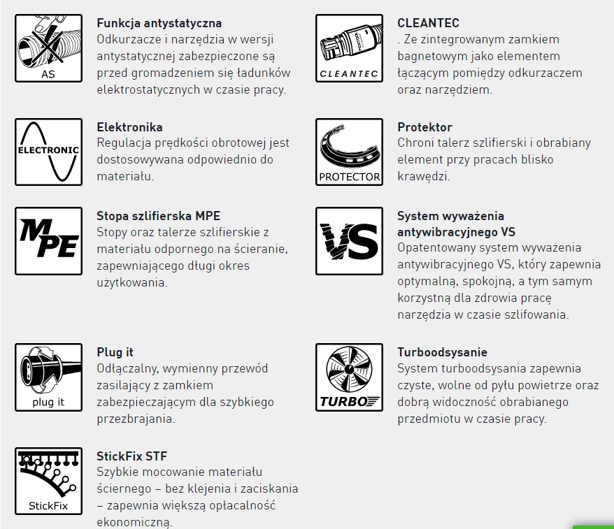 - Заміна абразивів і шліфувальних пластин без інструментів, ідеально підібраних до машини та системи.