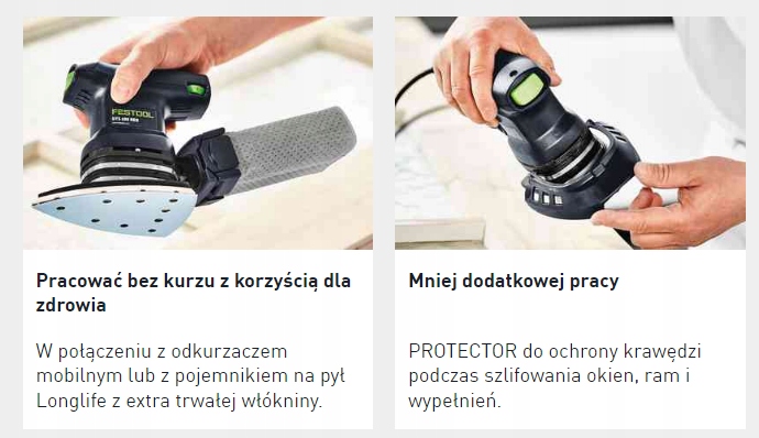 - Перевага для здоров’я та менше додаткової роботи: без пилу завдяки мобільному пилососу очищувачем або з контейнером для пилу Longlife і із застосуванням захисту PROTECTOR для безпечного шліфування вздовж віконниць, рам і заповнень