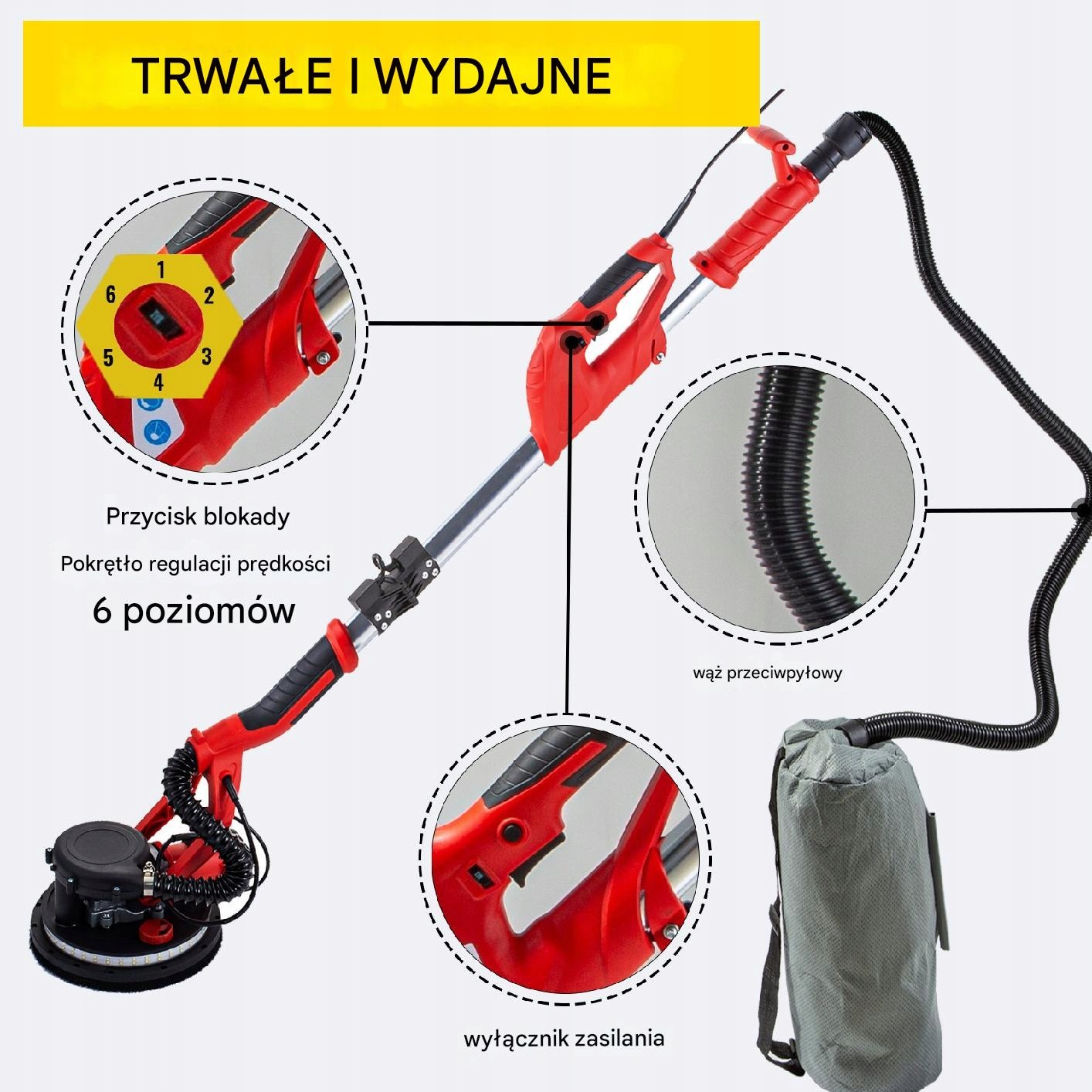 Професійна шліфувальна машина для штукатурки, штукатурки та штукатурки, оснащена двигуном 750W, регулюванням швидкості та телескопічною конструкцією. Завдяки світлодіодному освітленню та системі відведення пилу забезпечує комфортну та точну роботу навіть у складних умовах.