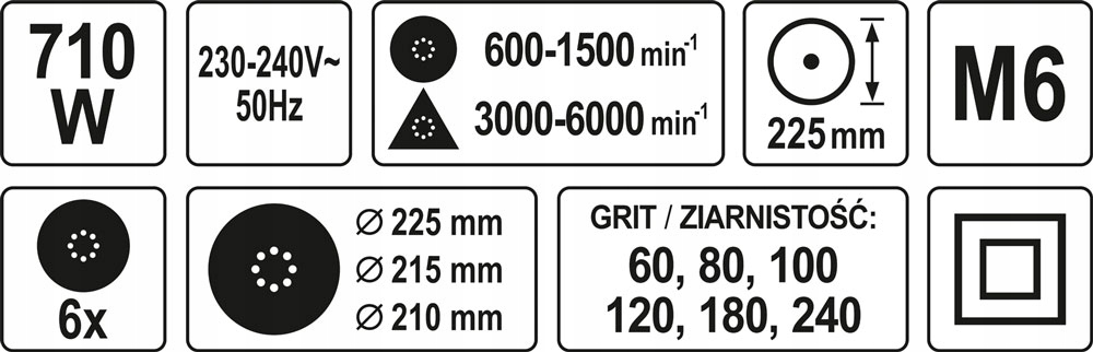 - Діаметр дисків для наждачного паперу [мм]: 225 / 215 / 210