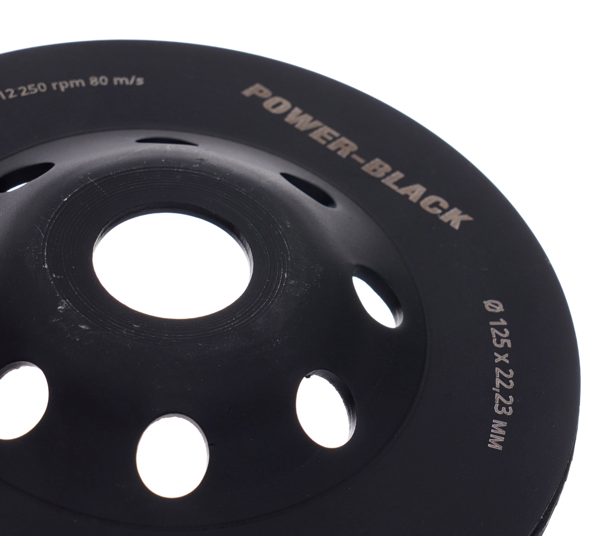 Алмазний чашковий диск POWER-BLACK turbo підходить для усунення нерівностей, формування та шліфування великих бетонних поверхонь. Алмазний шліфувальний круг використовується для очищення та шліфування нерівностей на поверхнях бетону, відкритого бетону, цегли, бруківки, клінкеру, газобетону та керамічної плитки. Алмазний чашковий диск, призначений для шліфування бетонних поверхонь за допомогою кутової шліфувальної машини, має тривалий термін служби.