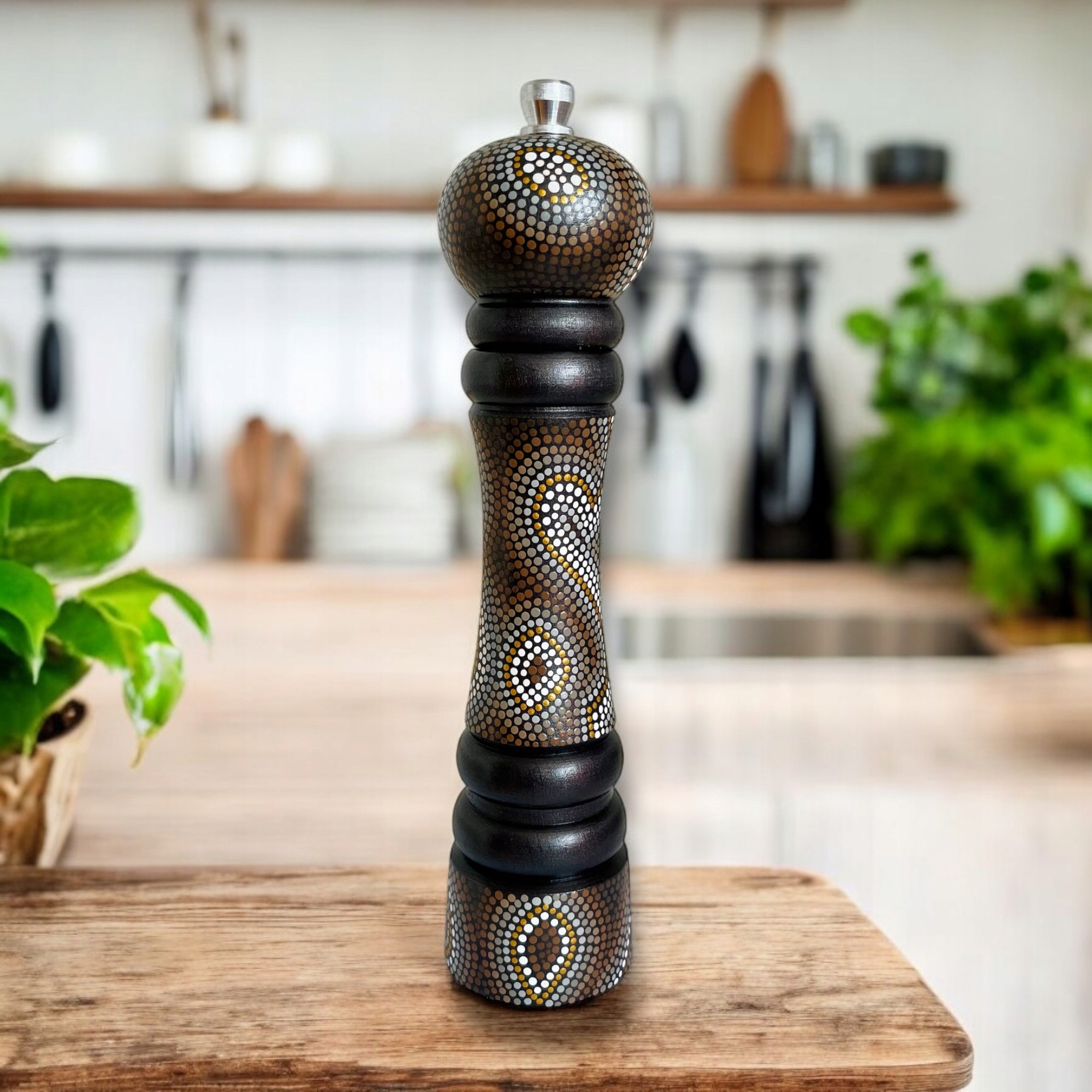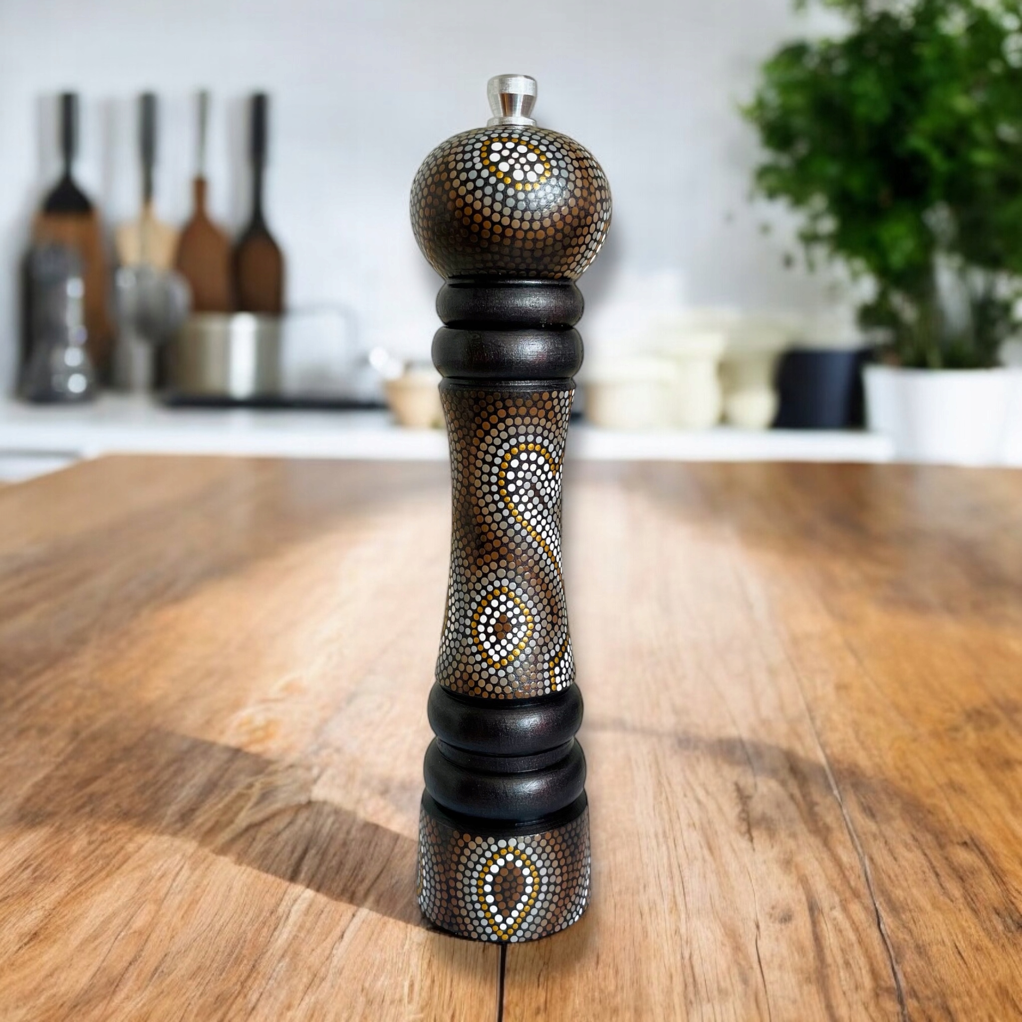 рука - вкладена соляна та перцева шліфувальна машина , натхненна аборигенним мистецтвом. Унікальний візерунок, створений за допомогою техніки DOT, надає йому унікального персонажа. Поєднання бронзи, чорного, білого, сірого та золота означає, що шліфувальна машина відповідає як класичним, так і сучасним інтер’єрам. Зроблено з постійного букового дерева з керамічним механізмом забезпечення точного шліфування. Відмінний вибір для любителів оригінальних кухонних аксесуарів.