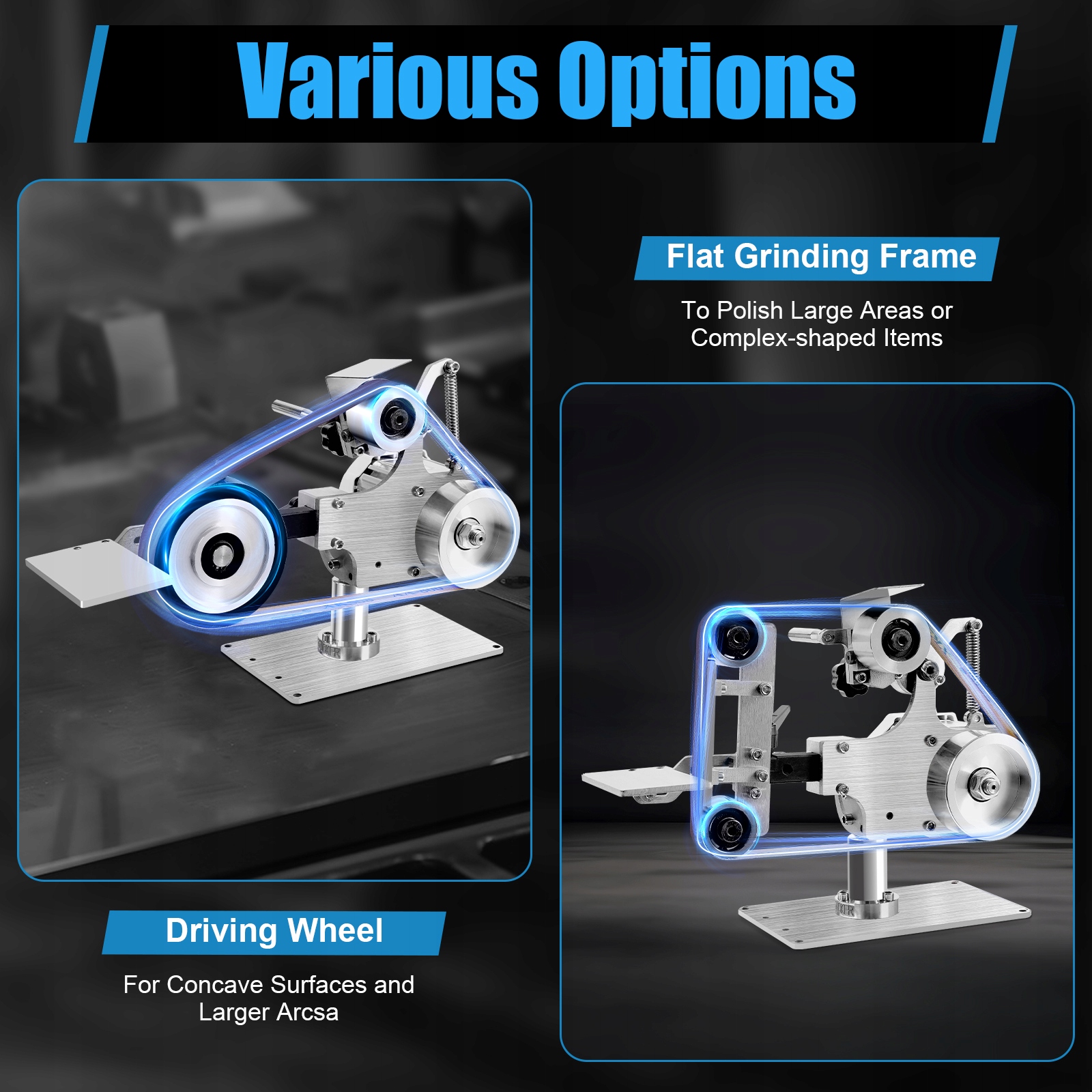 ✅ Варіанти дороги: підходить для двох способів подрібнення. Колесо (3,9 дюйма) можна використовувати для увігнутого поверхні та більших дуг. Плоский шліфувальний каркас може бути використаний для відшліфування великих поверхонь або предметів у складній формі, задоволення різних потреб шліфування.