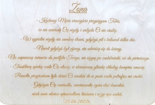 Просматривая «Клятва брака Смешное свадебное подарок дерево», вы можете быть уверены, что данный товар из каталога «[rubrica_name]» будет доставлен из Польши и проверен на целостность. В цене товара, указанной на сайте, учтена доставка из Польши. Внимание!!! Товары для Евросоюза, согласно законодательству стран Евросоюза, могут отличаться упаковкой или наполнением.